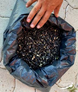 "A mai munkánk során törpeharcsa-ivadékot gyűjtöttünk a Balaton két befolyóján. Először Balatonbogláron a Jamai-patakon, utána pedig Fonyódon, a Keleti-Bozót-csatornán. A csatornák mindkét oldalán lévő töltést lassan végigjárva, az erre készült merítőnyéllel, azon apró szemű merítőfejjel szerelve dolgoztunk. A két területen összesen 34 db törpeharcsa "ivadékfelhőt" sikerült kimernünk, amelyek egyedmérete változó volt. A munka végén az összegyűjtött ivadék mennyiségét az alábbi módon becsültük meg: egy kisebb pohárnyi ivadék súlyát lemértünk, amelyben a jellemző szórásnak megfelelően 1-3 cm hosszú halak voltak, majd a számolás után kaptuk meg, hogy a lemért pohárnyi 55 gramm törpeharcsa ivadék 154 db egyedből állt. Ebből számítva kaptuk meg a végeredményt: a mai napon összesen 5545 gramm, 15.526 db. törpeharcsát sikerült kifogni."