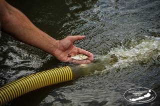A mennyiséget arányosan elosztva telepítettük be szivornyás leengedéssel. Az első kör a zalavári út keleti végén található Zala hídnál került be, itt 17 500 darab előnevelt ponty talált új otthont. A következő helyszínünk a déli tározórész keleti oldalán végigfutó töltés egyik pontja volt, itt is 17 500 darab egyed került kihelyezésre.