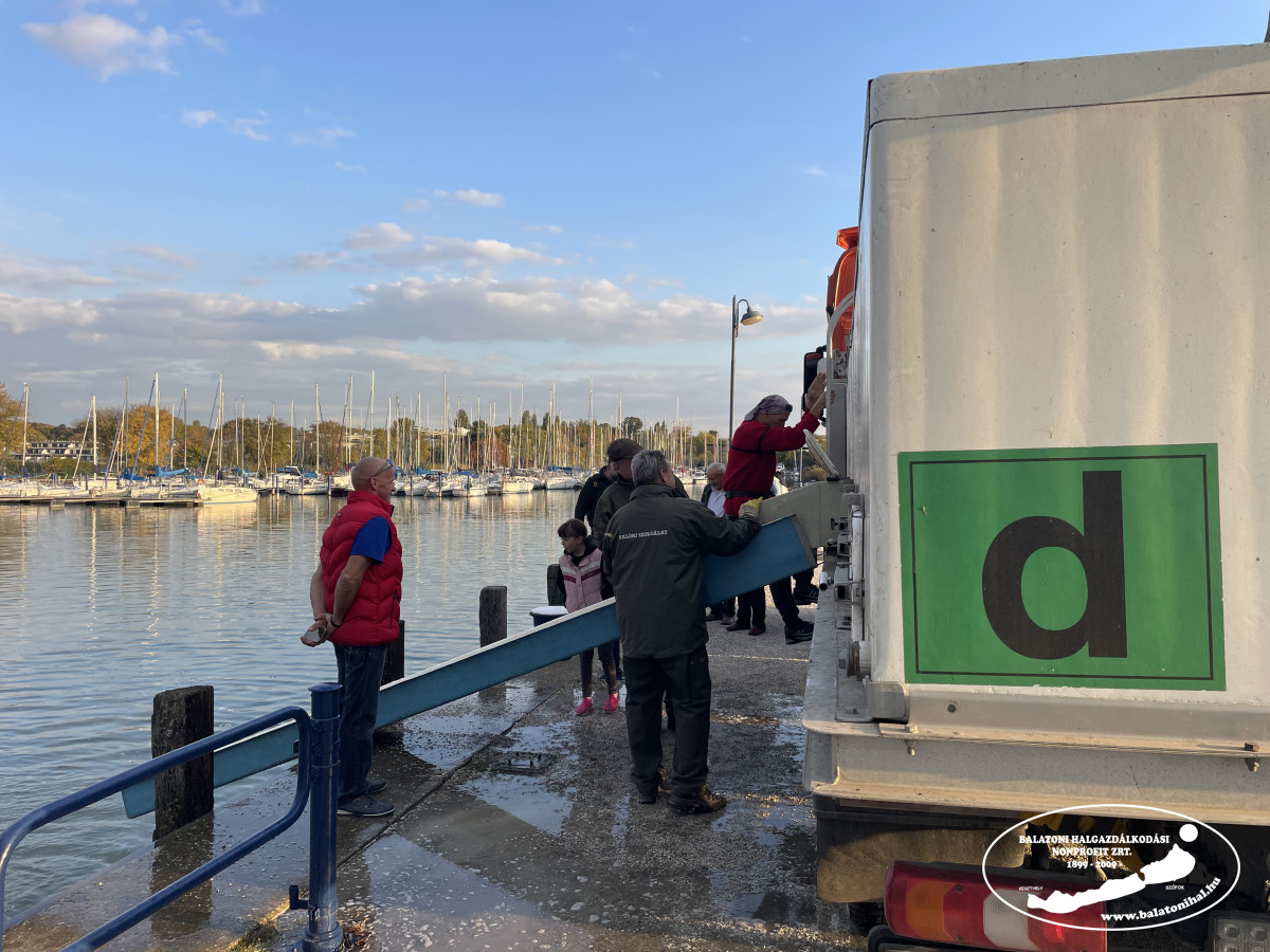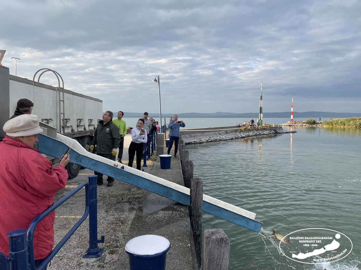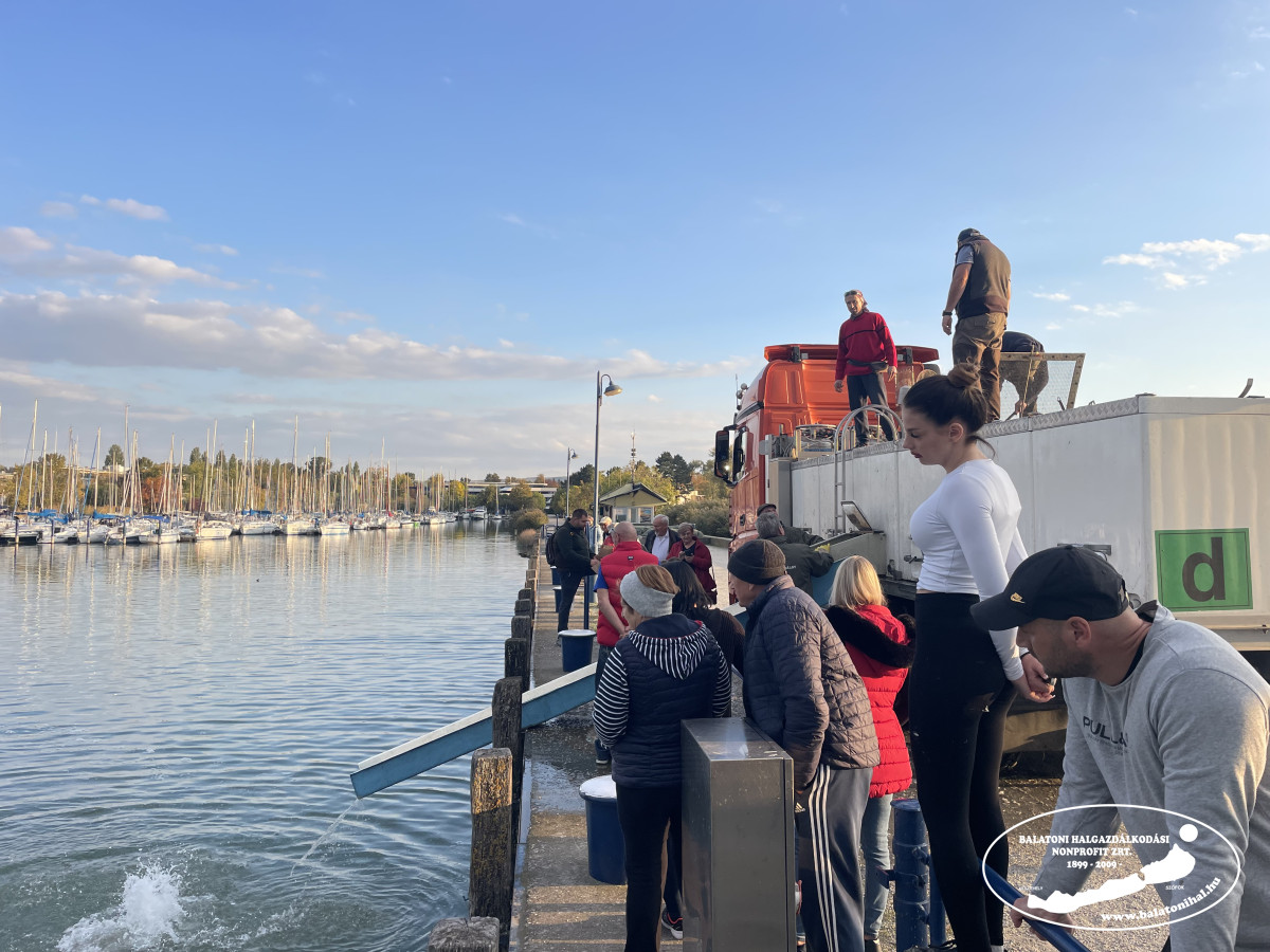 A fentnevezett mennyiséget a kikötő nyugati mólószárán engedtük le a halszállító autó kádjairól a helyi horgászok és a kedves érdeklődök jelenlétében.