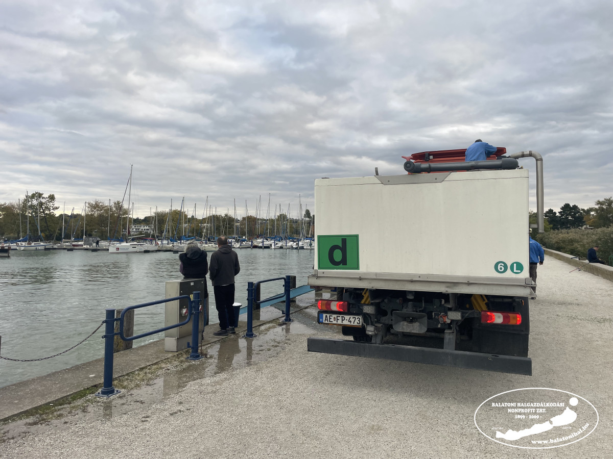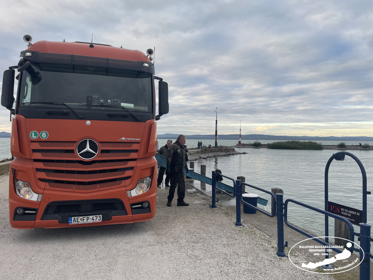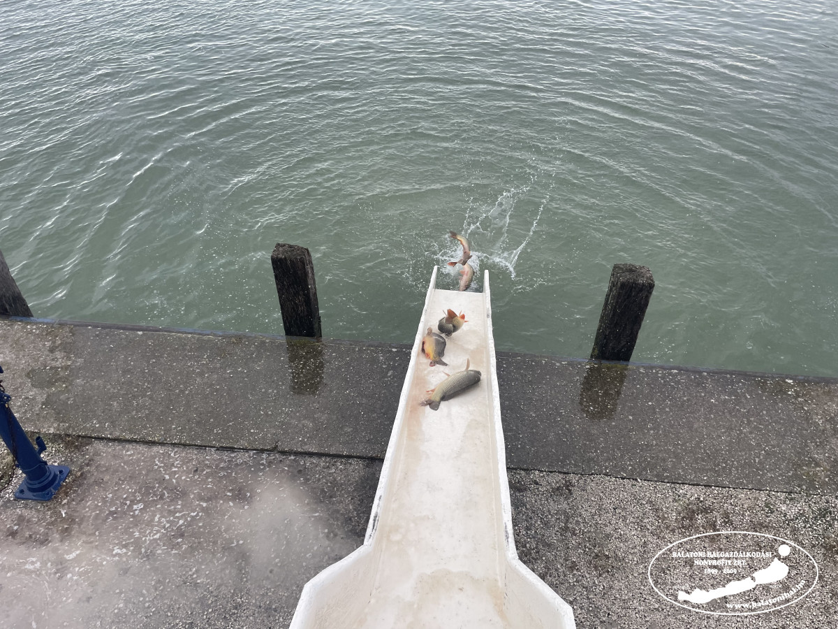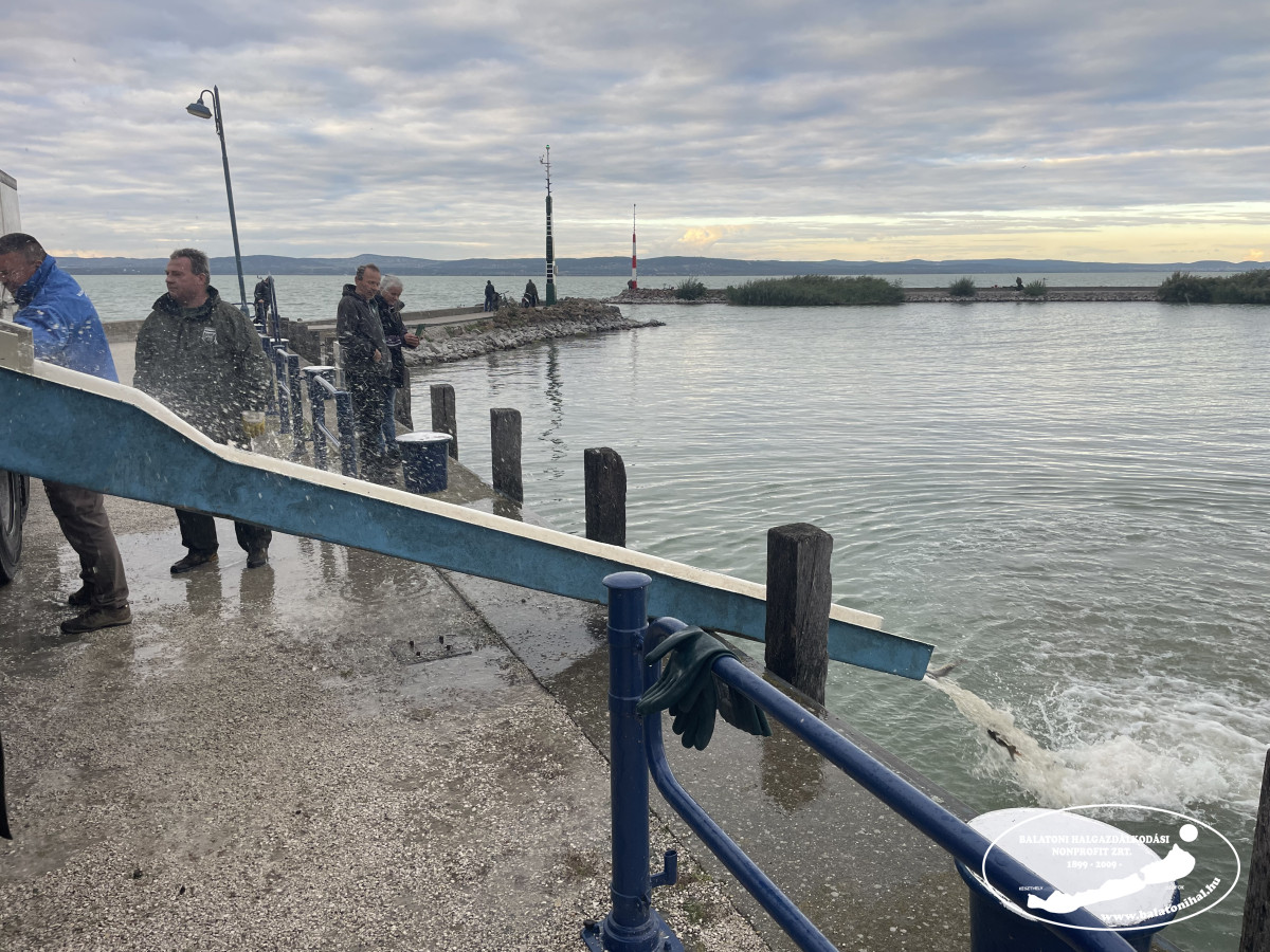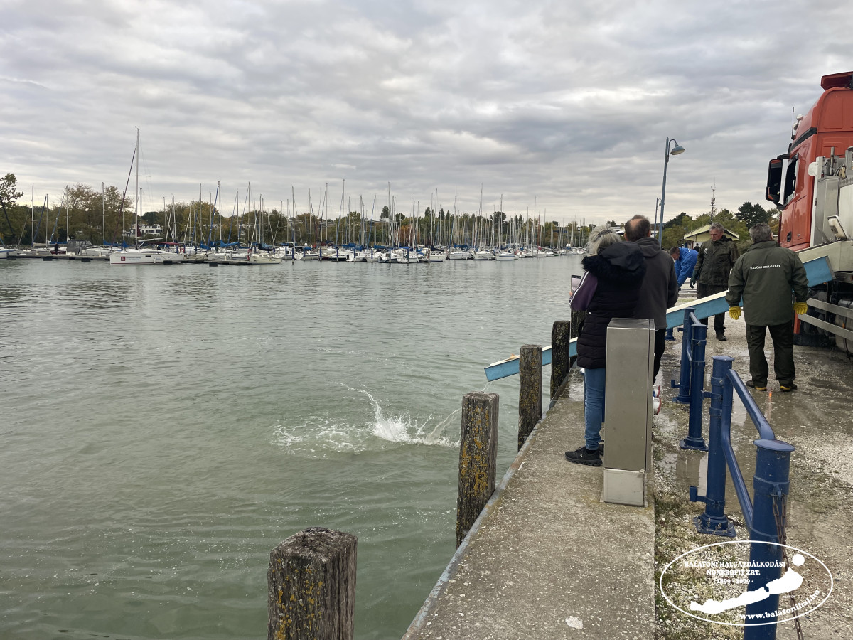 A fent nevezett mennyiséget Balatonszemesen, a kikötőben engedtük le csúszda segítségével a Balatonba.