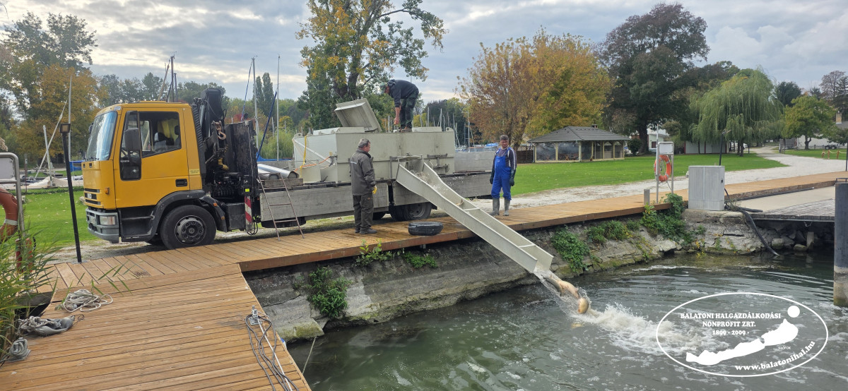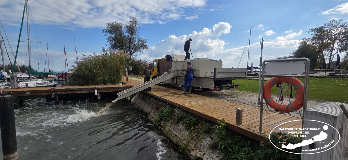 Ma három fuvarral, több mint 12 tonna háromnyaras pontyot telepítettünk a Balatonba. A maival együtt idén összesen 188 113 kg-ot teljesítettünk a 300.000 kg-os éves telepítési kötelezettségünkből. A fennmaradó mennyiséget decemberig fogjuk a tóba juttatni.