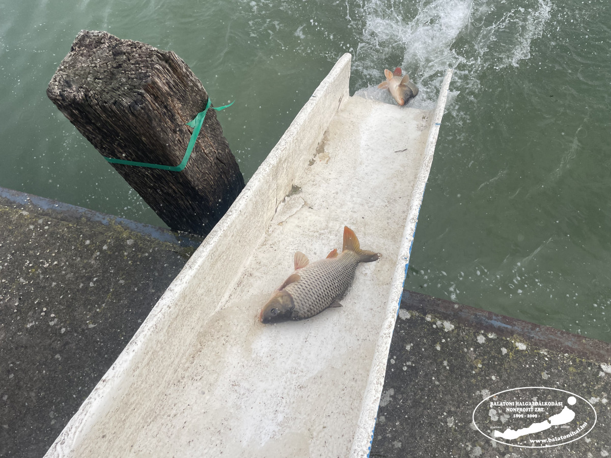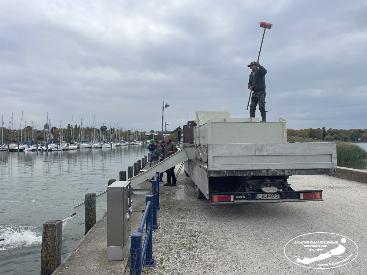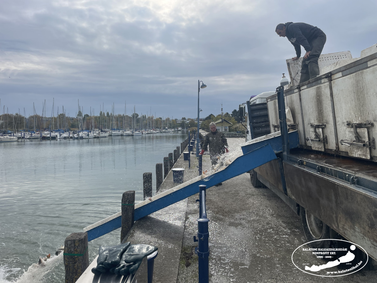 Az említett két halszállítmányt a balatonszemesi kikötőben engedtük le csúszda segítségével a vízbe.