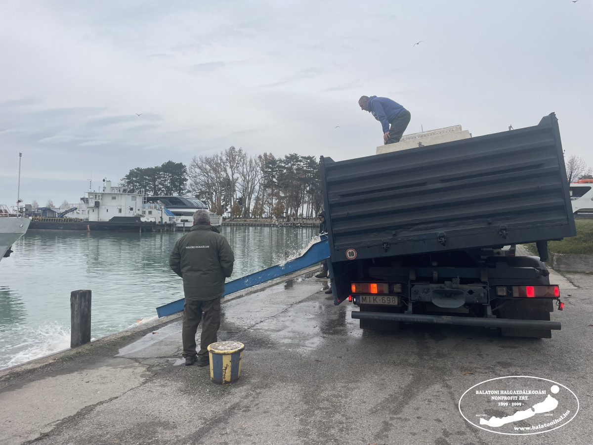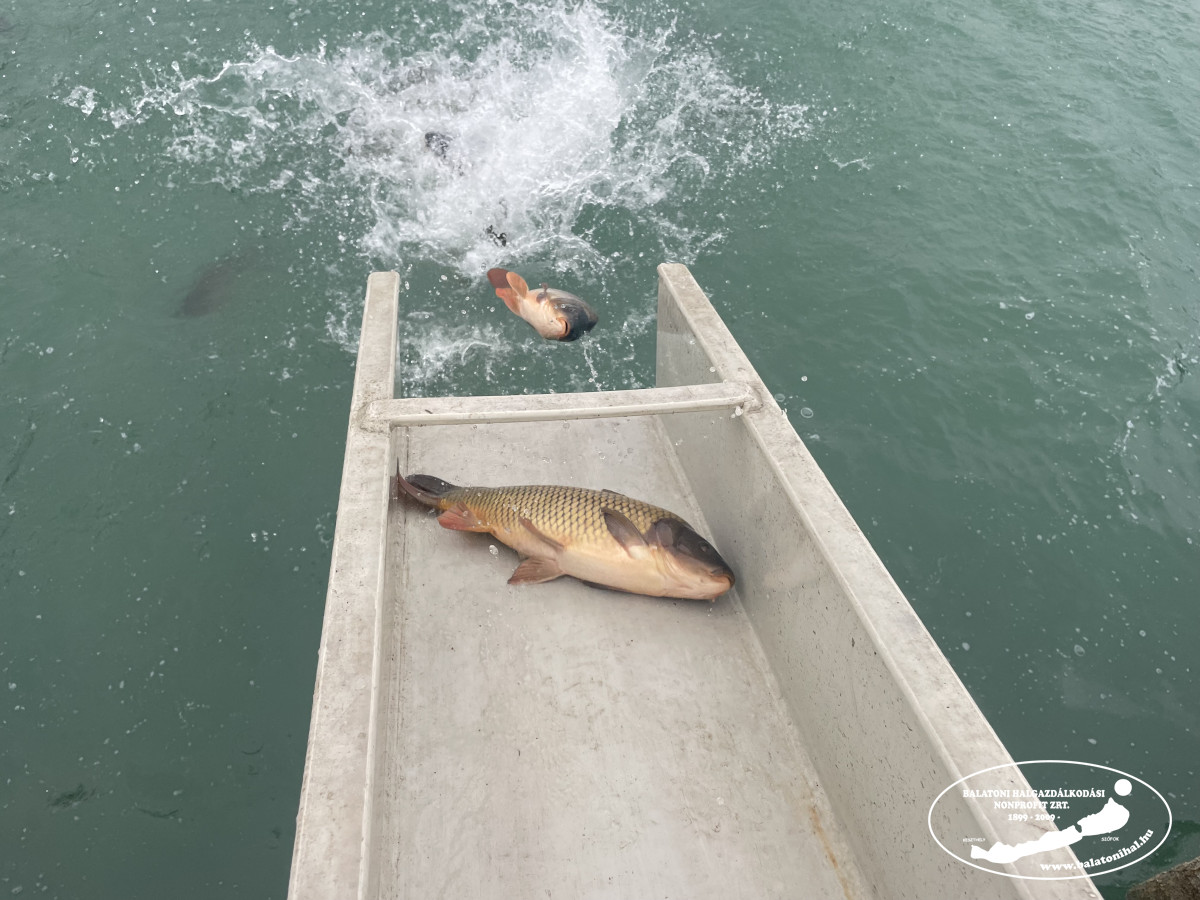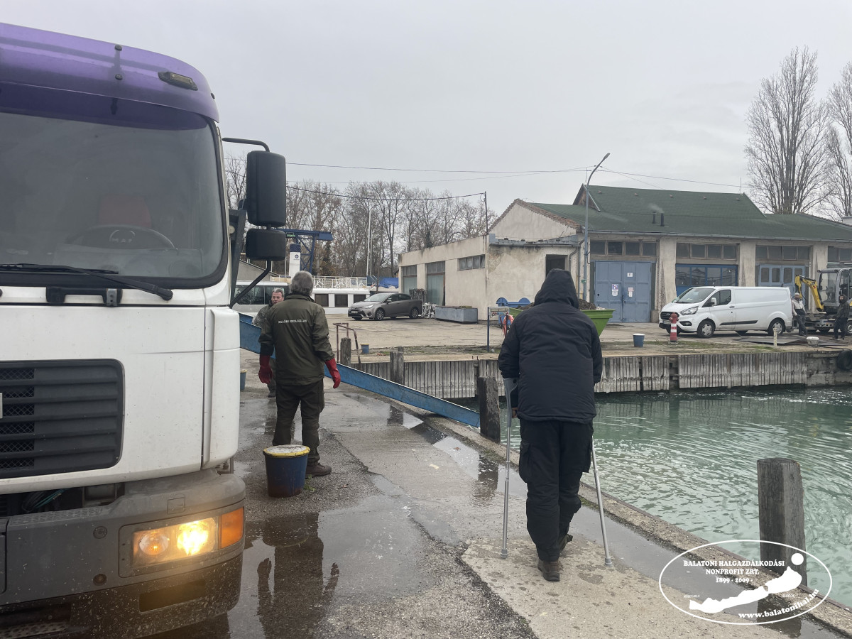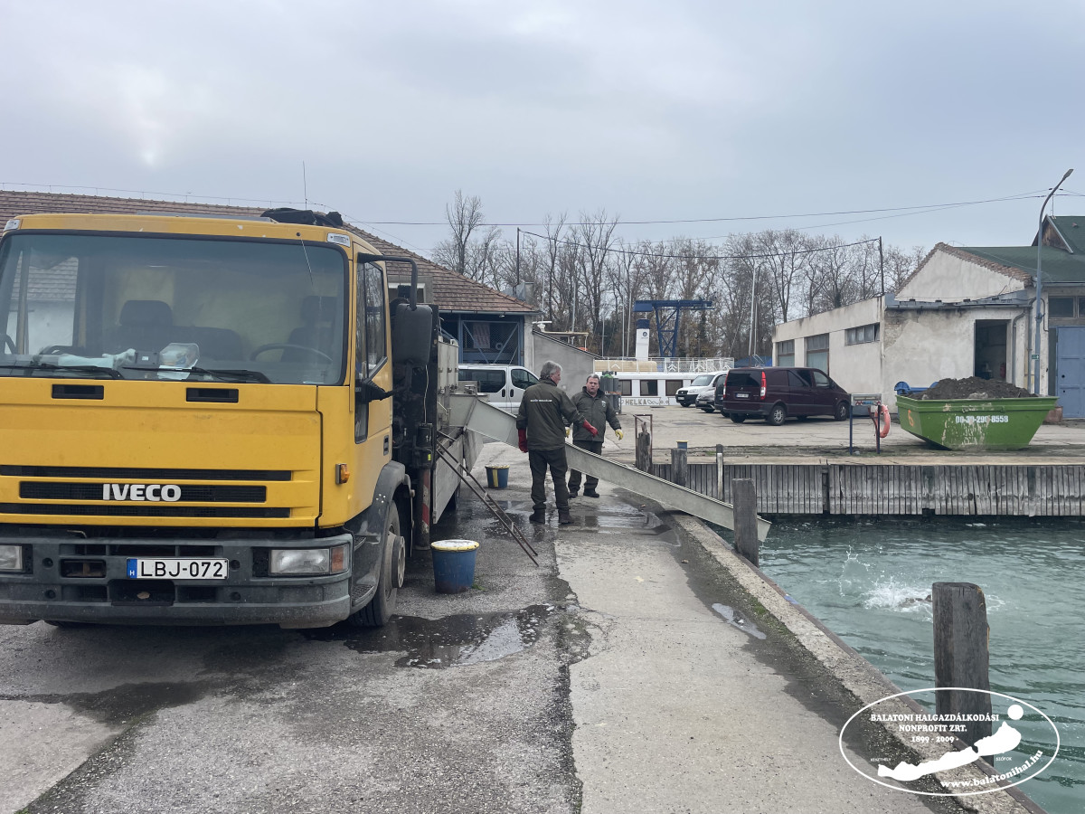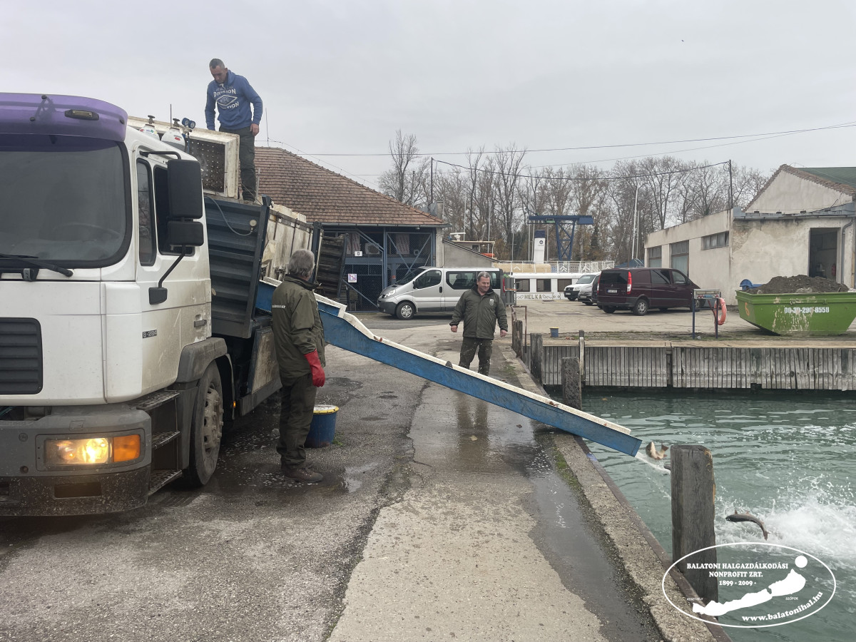 A mai halszállítmányokat Siófokon, a BAHART kikötőben engedtük le az autók kádjairól. A mai két fuvarral összesen 6 600 kg pontyot telepítettünk a Balatonba.