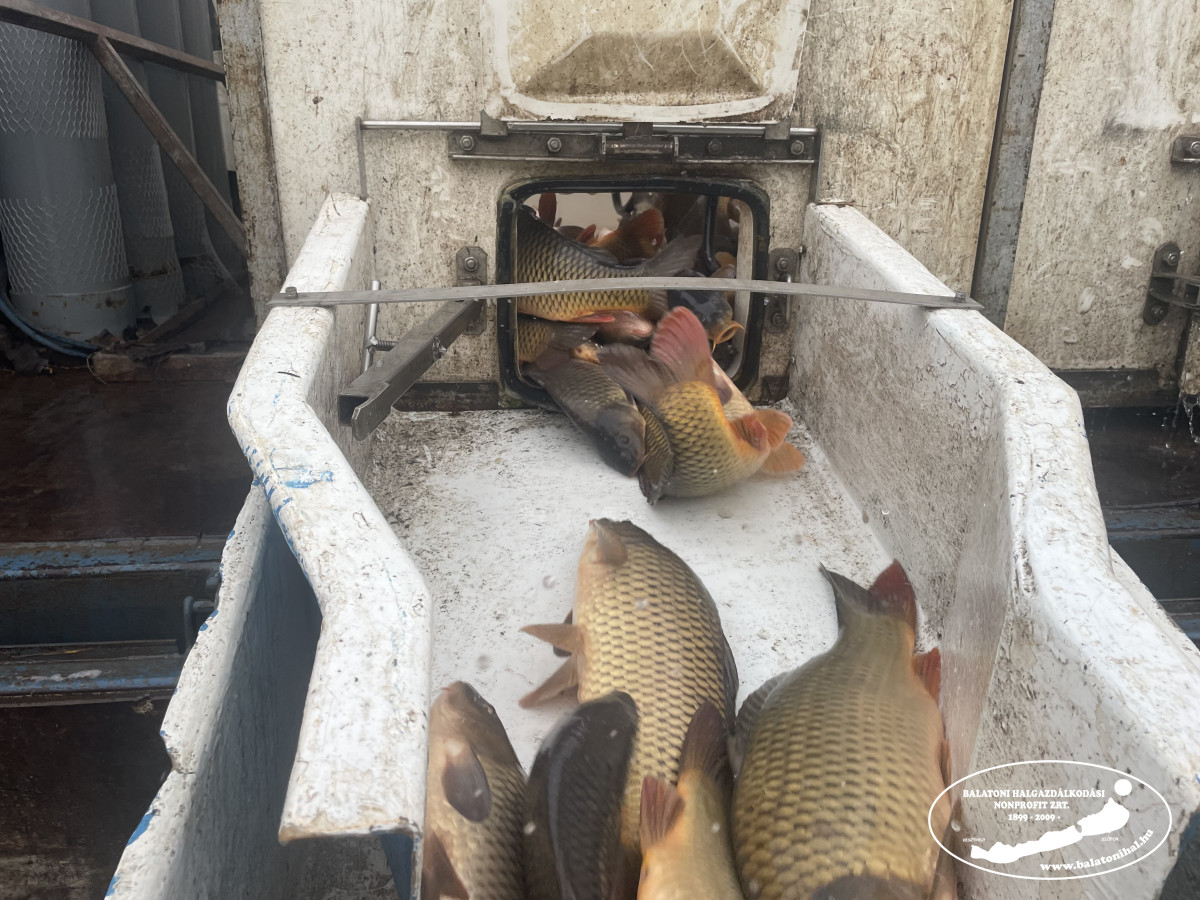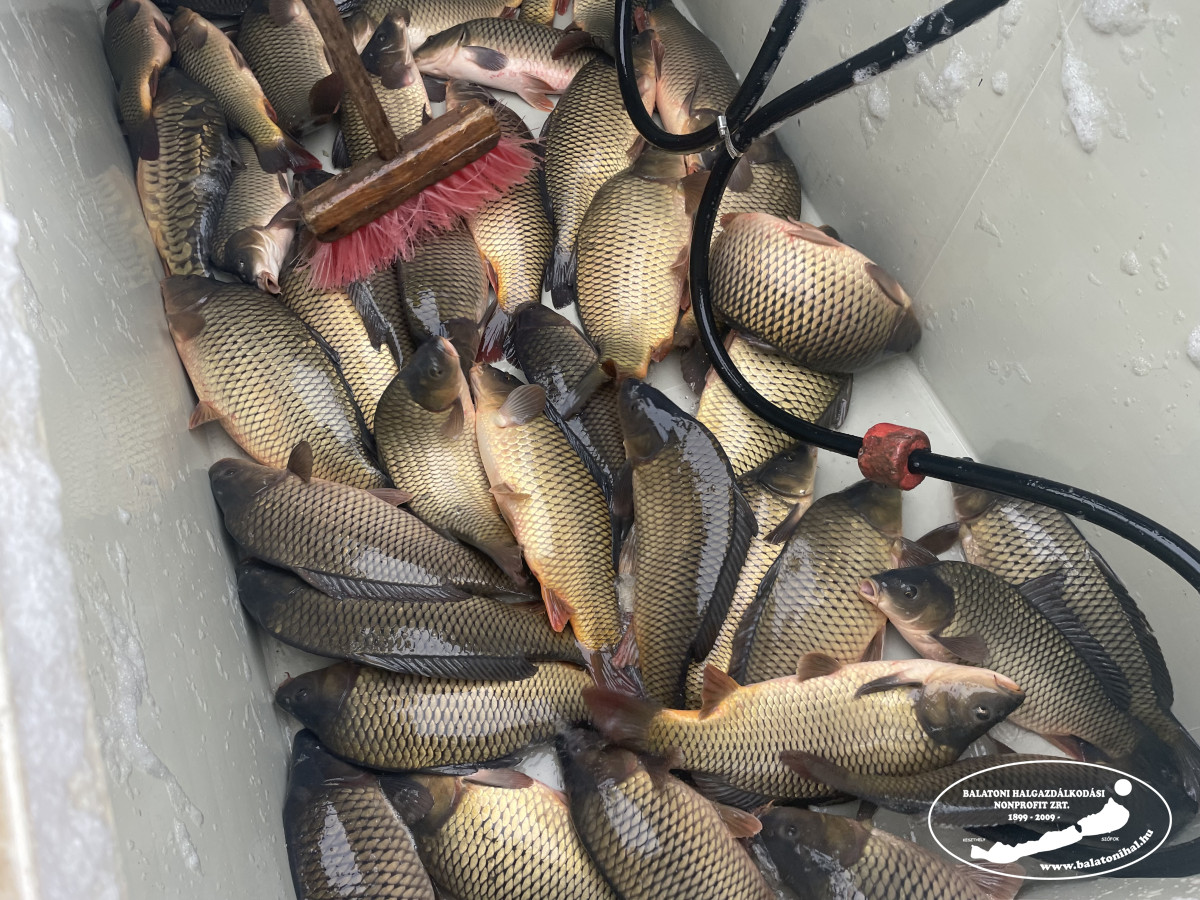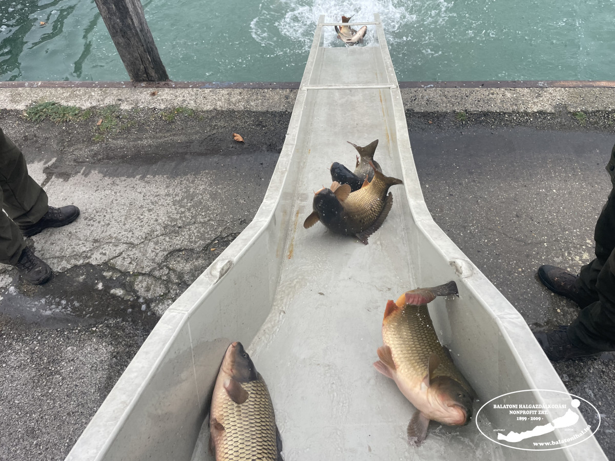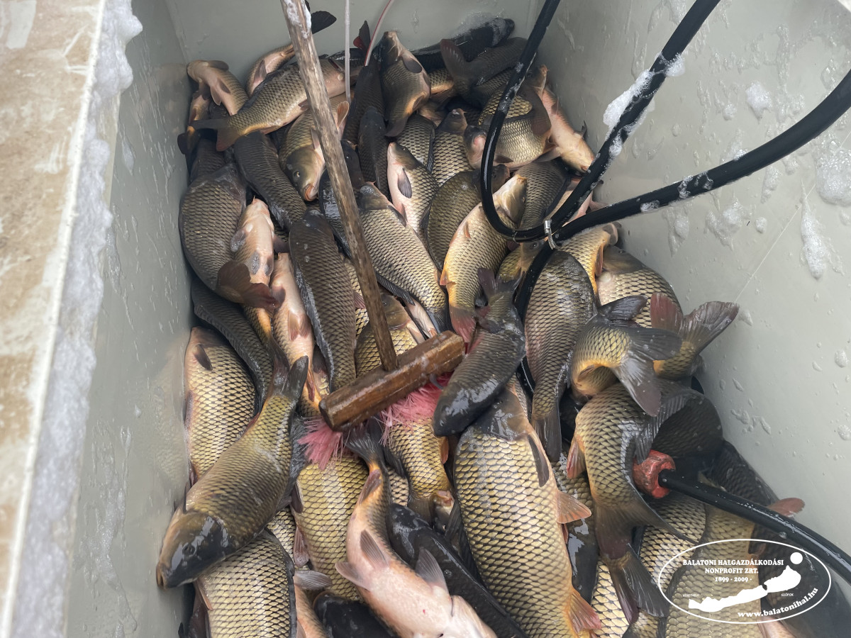 A mai halszállítmányokat Siófokon, a BAHART kikötőben engedtük le az autók kádjairól. A mai két fuvarral összesen 6 600 kg pontyot telepítettünk a Balatonba.