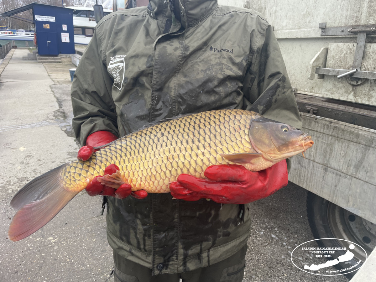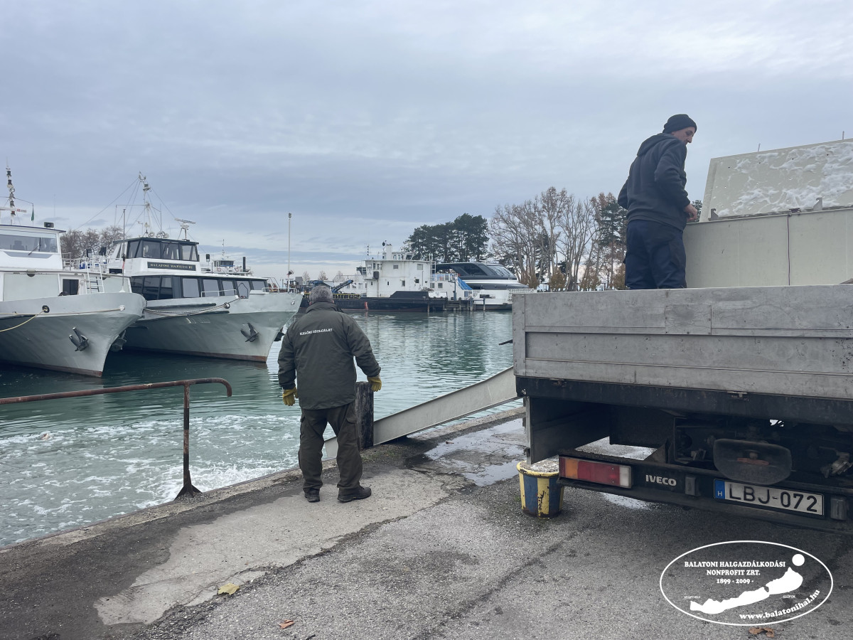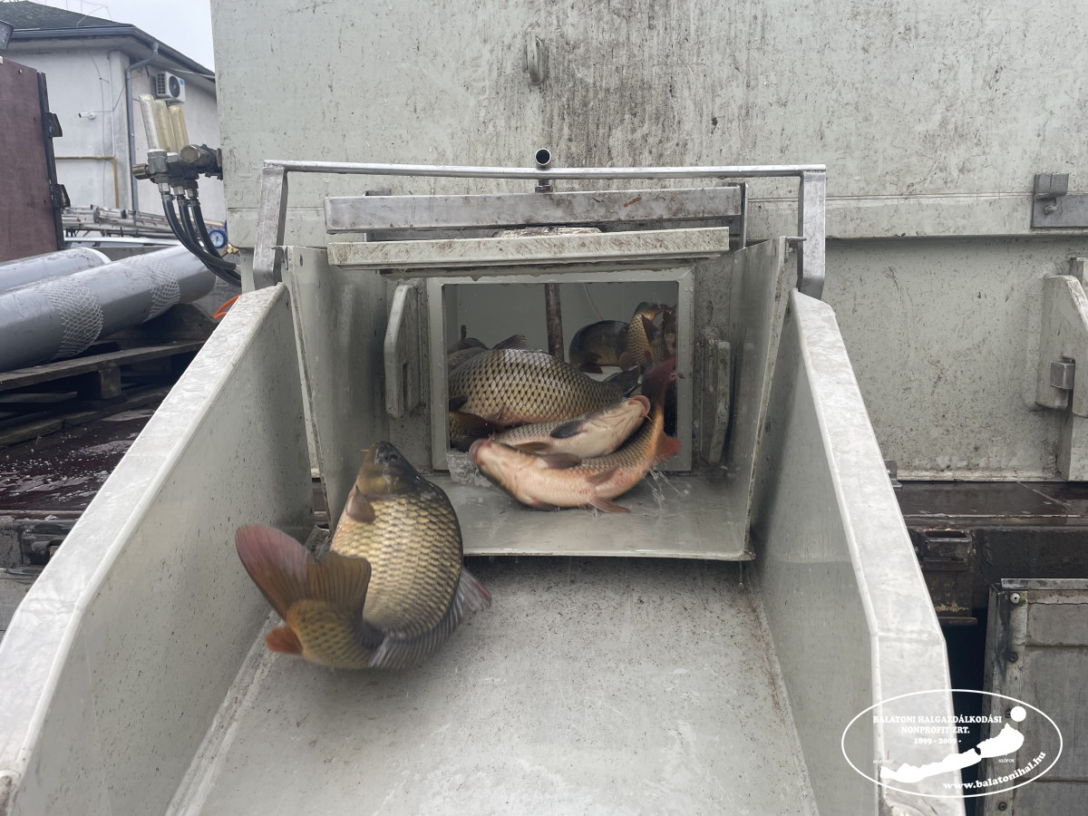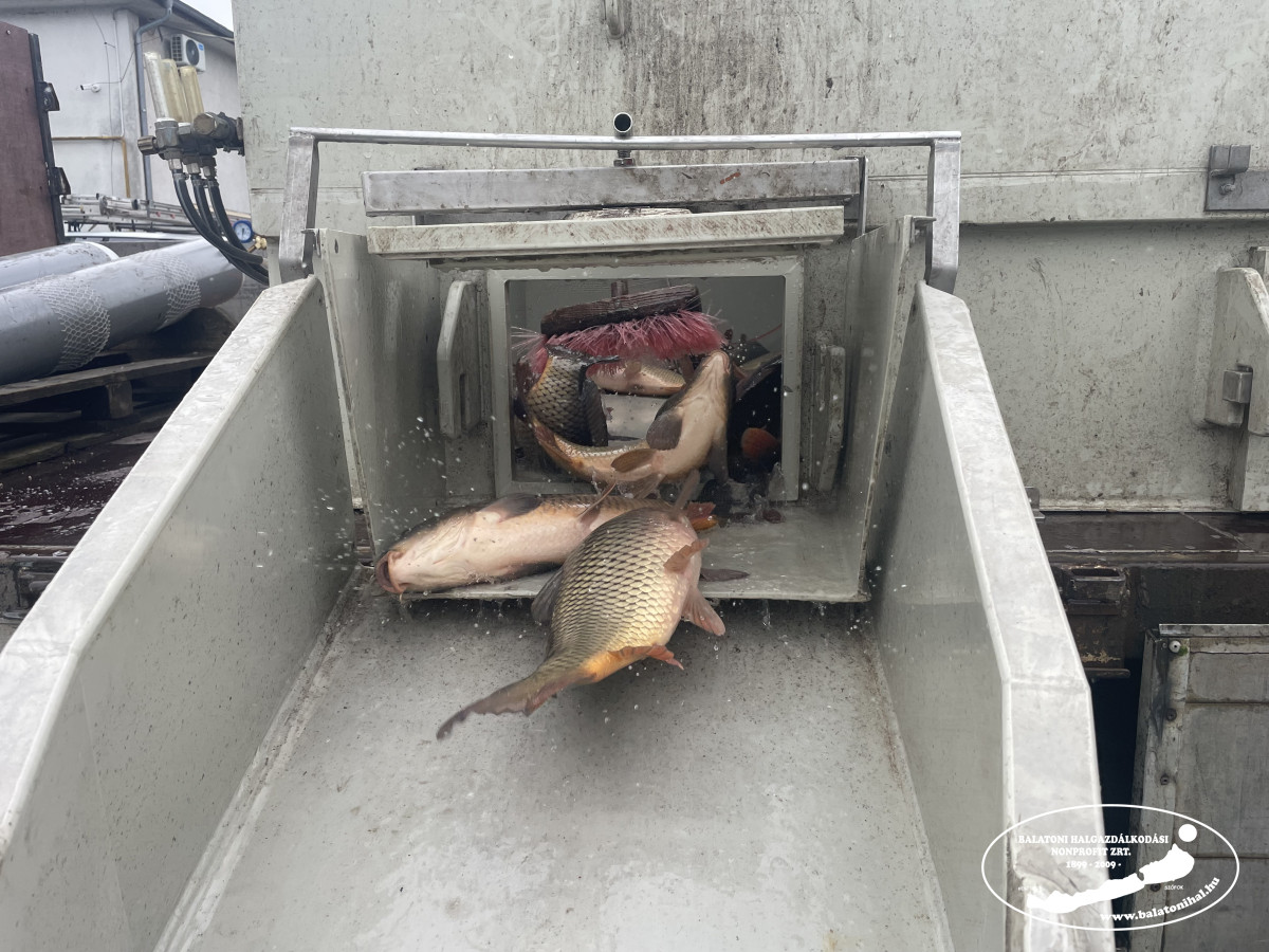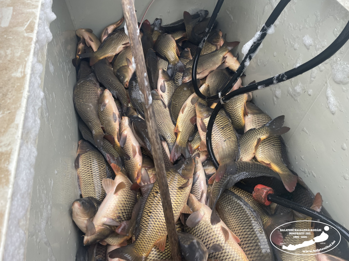 A mai halszállítmányokat Siófokon, a BAHART kikötőben engedtük le az autók kádjairól. A mai két fuvarral összesen 6 600 kg pontyot telepítettünk a Balatonba.