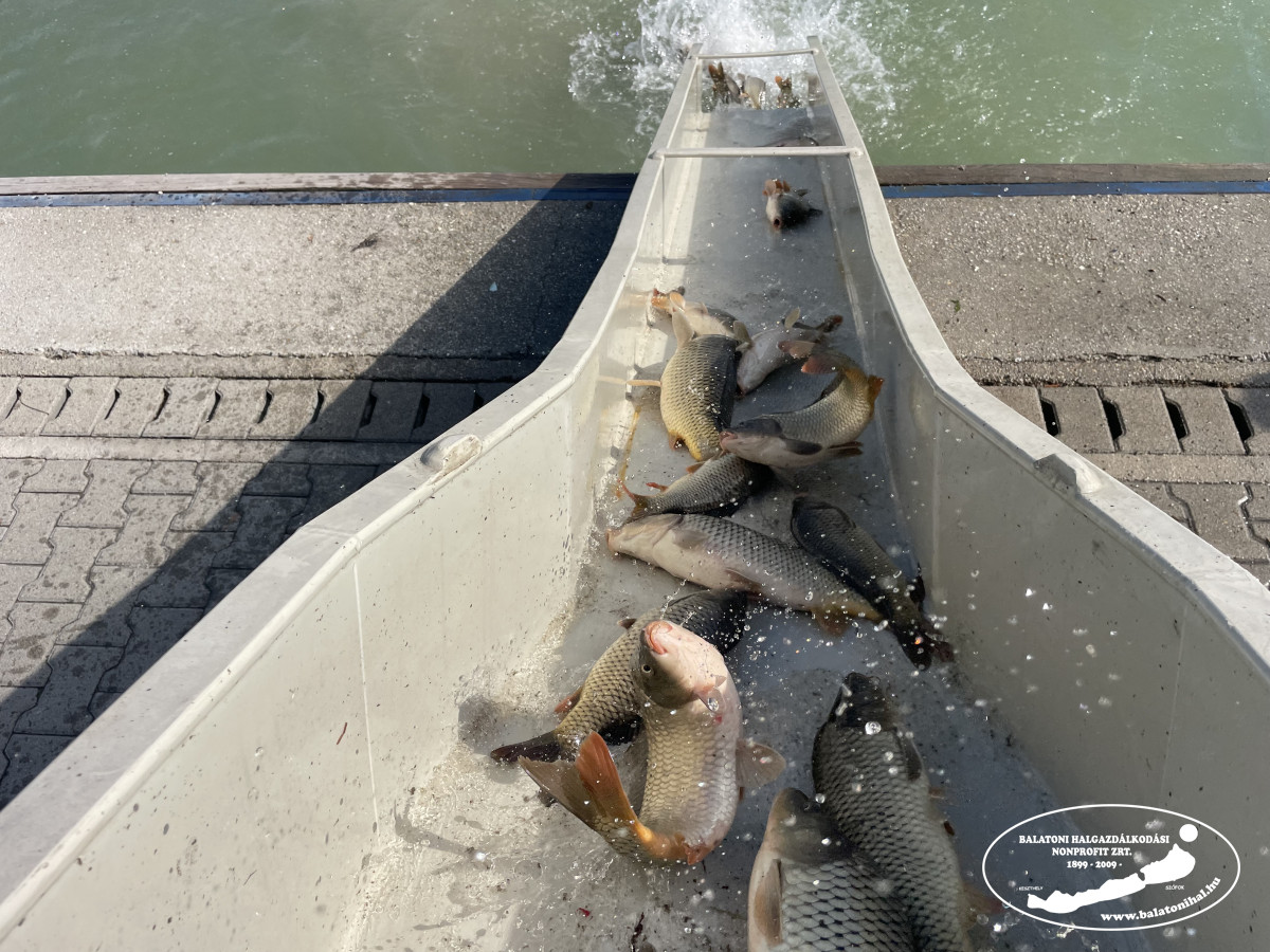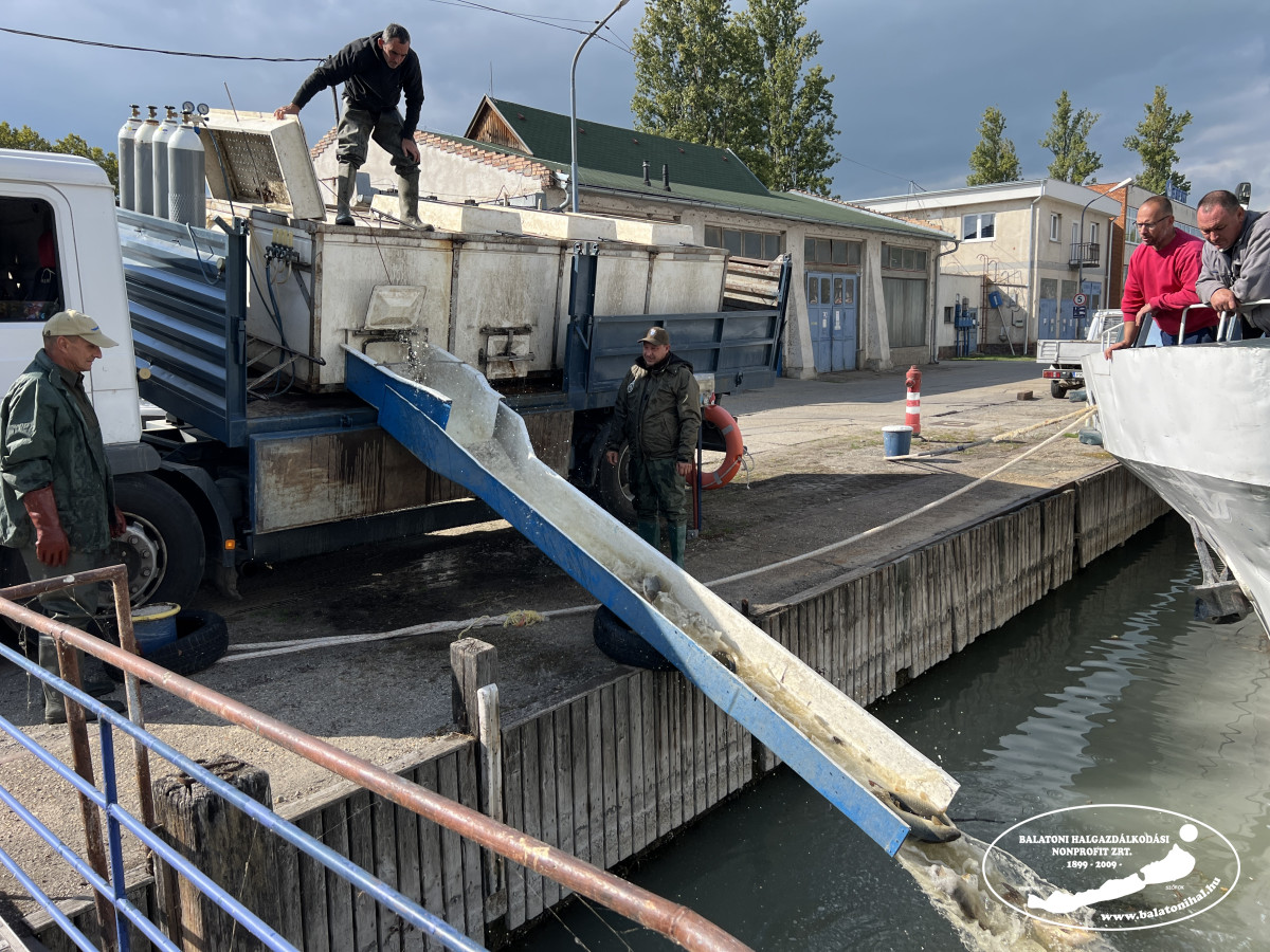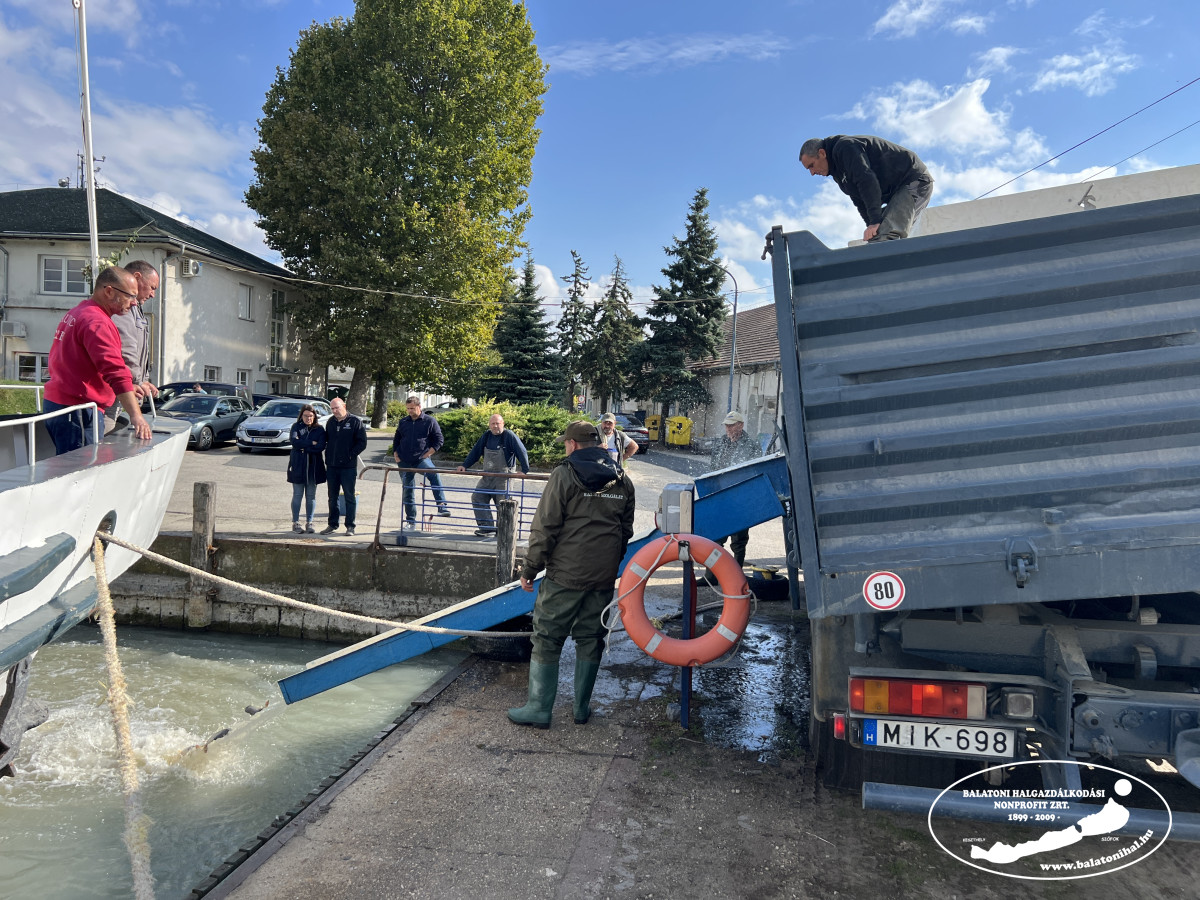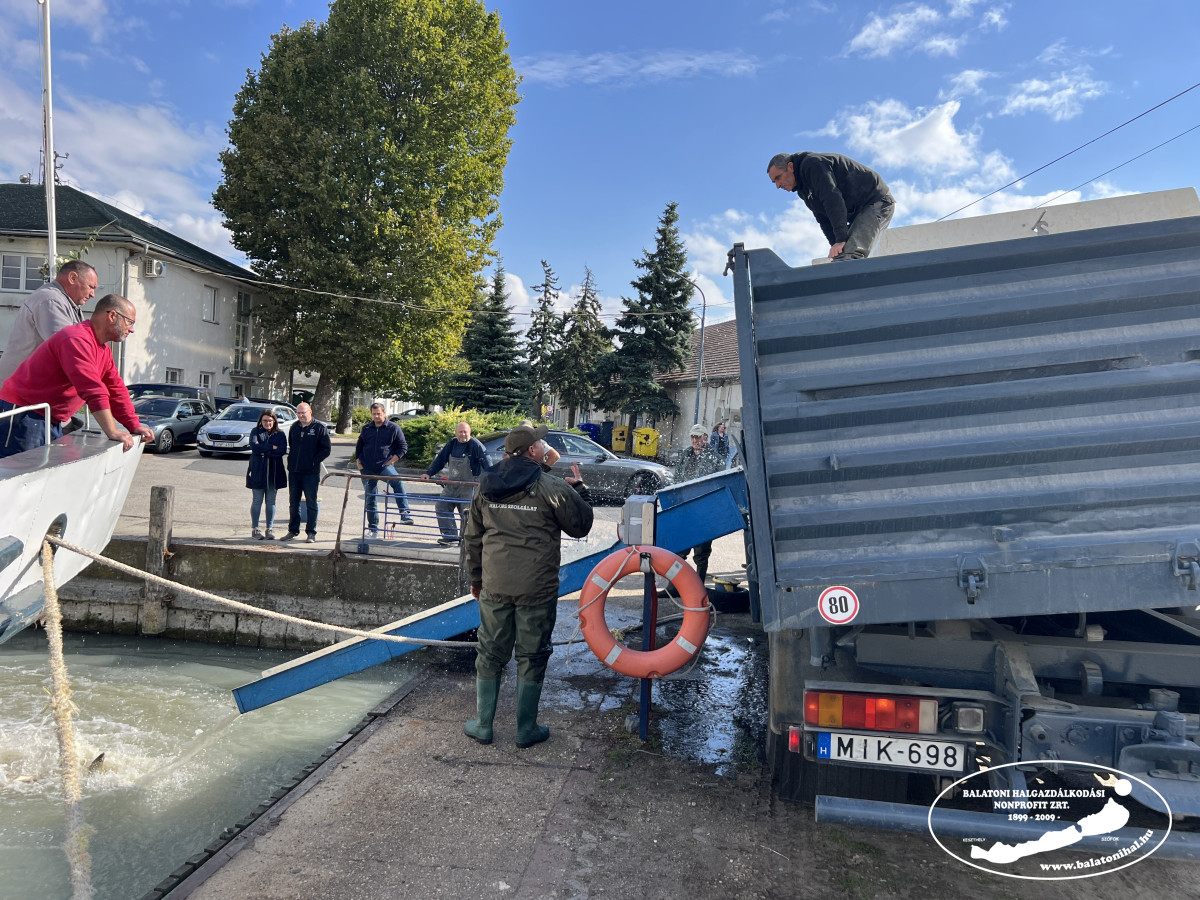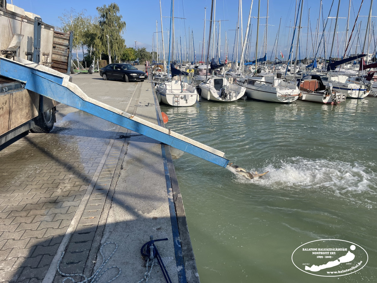 A balatonlellei kikötőben két fuvarral összesen 5 750 kg háromnyaras pontyot engedtünk le a halszállító autók kádjairól. Ezt követően a siófoki kikötőbe érkezett egy szállítmány. Itt 1 860 kg pontyot telepítettünk be a tóba.