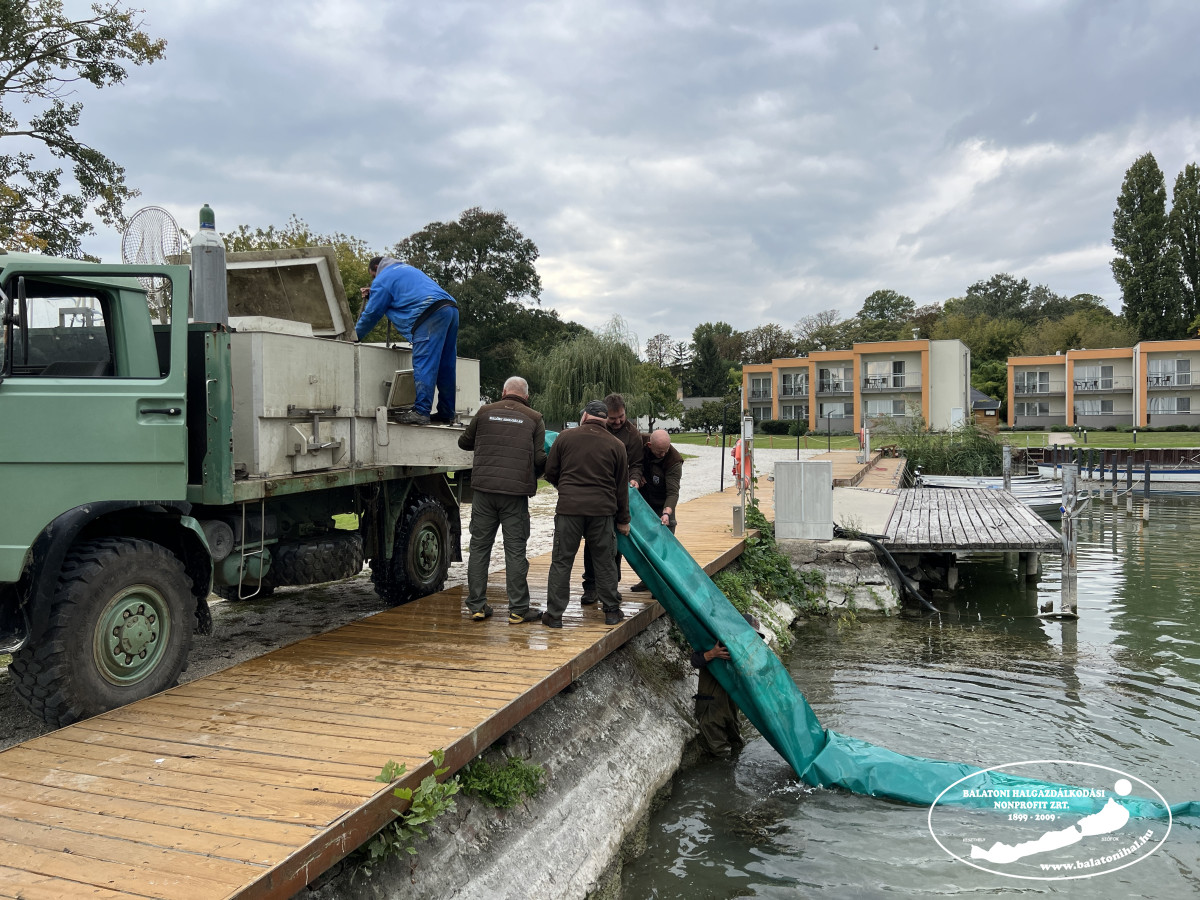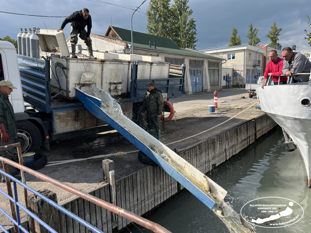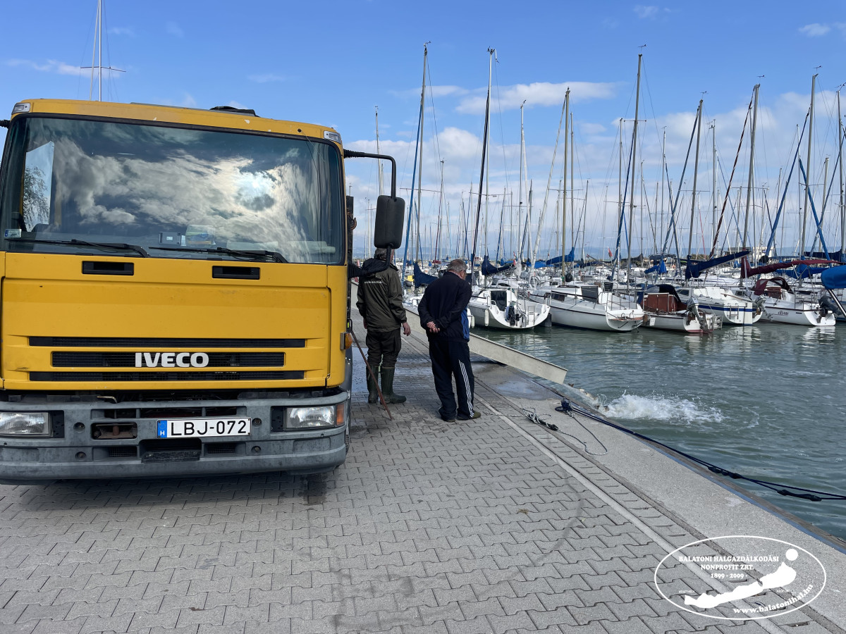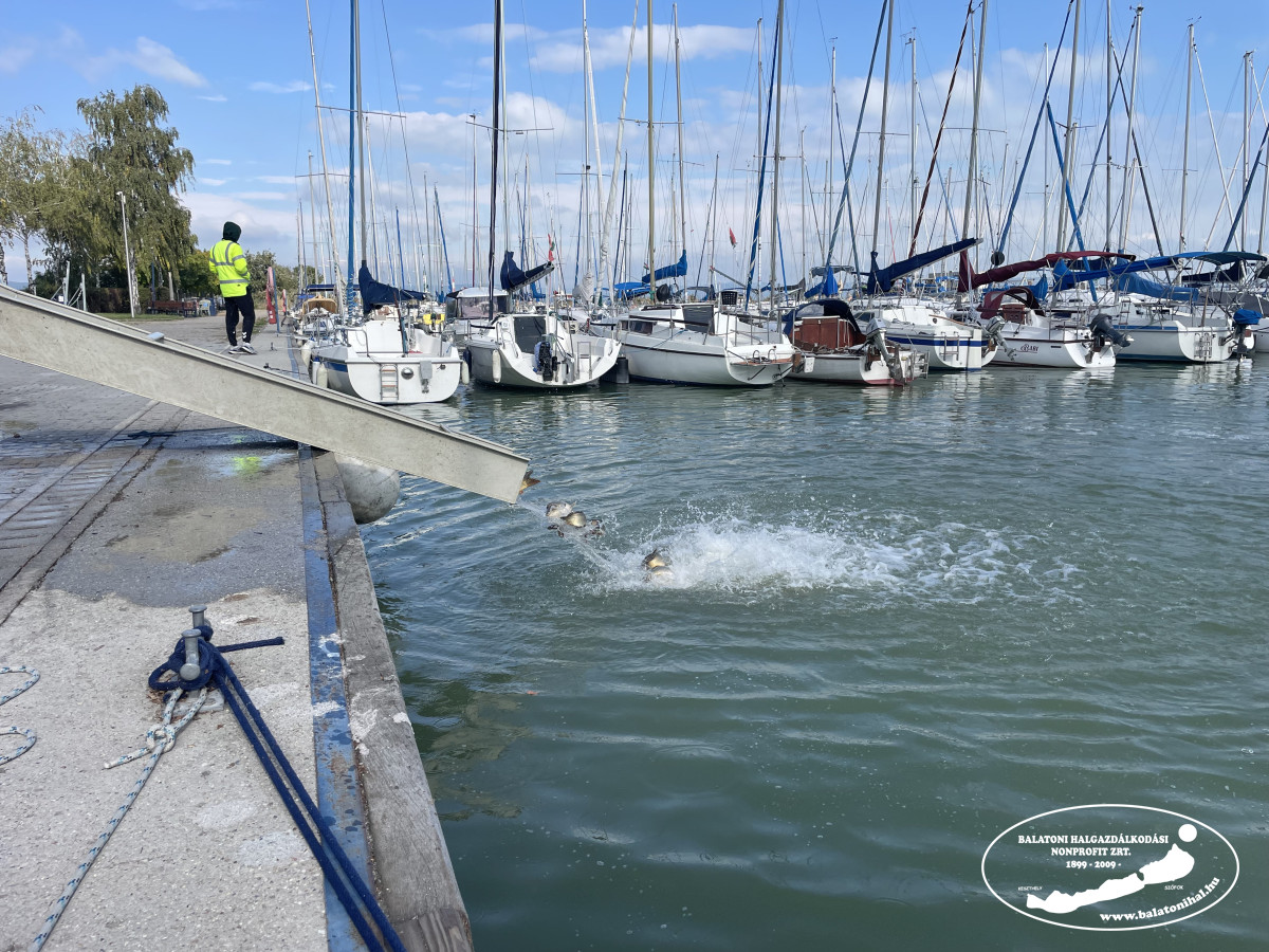 A balatonlellei kikötőben két fuvarral összesen 5 750 kg háromnyaras pontyot engedtünk le a halszállító autók kádjairól. Ezt követően a siófoki kikötőbe érkezett egy szállítmány. Itt 1 860 kg pontyot telepítettünk be a tóba.