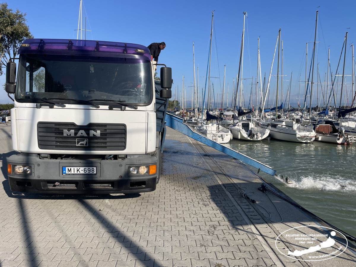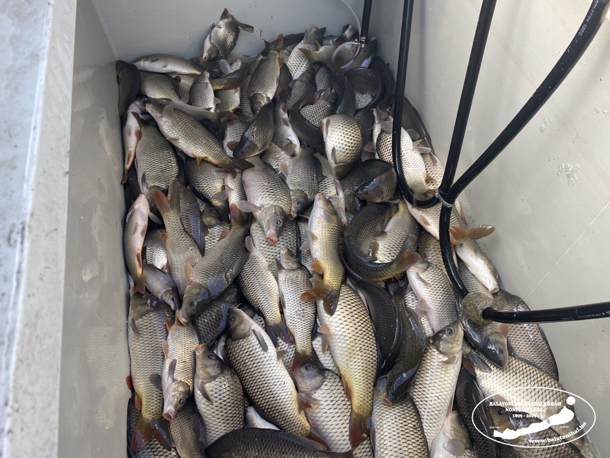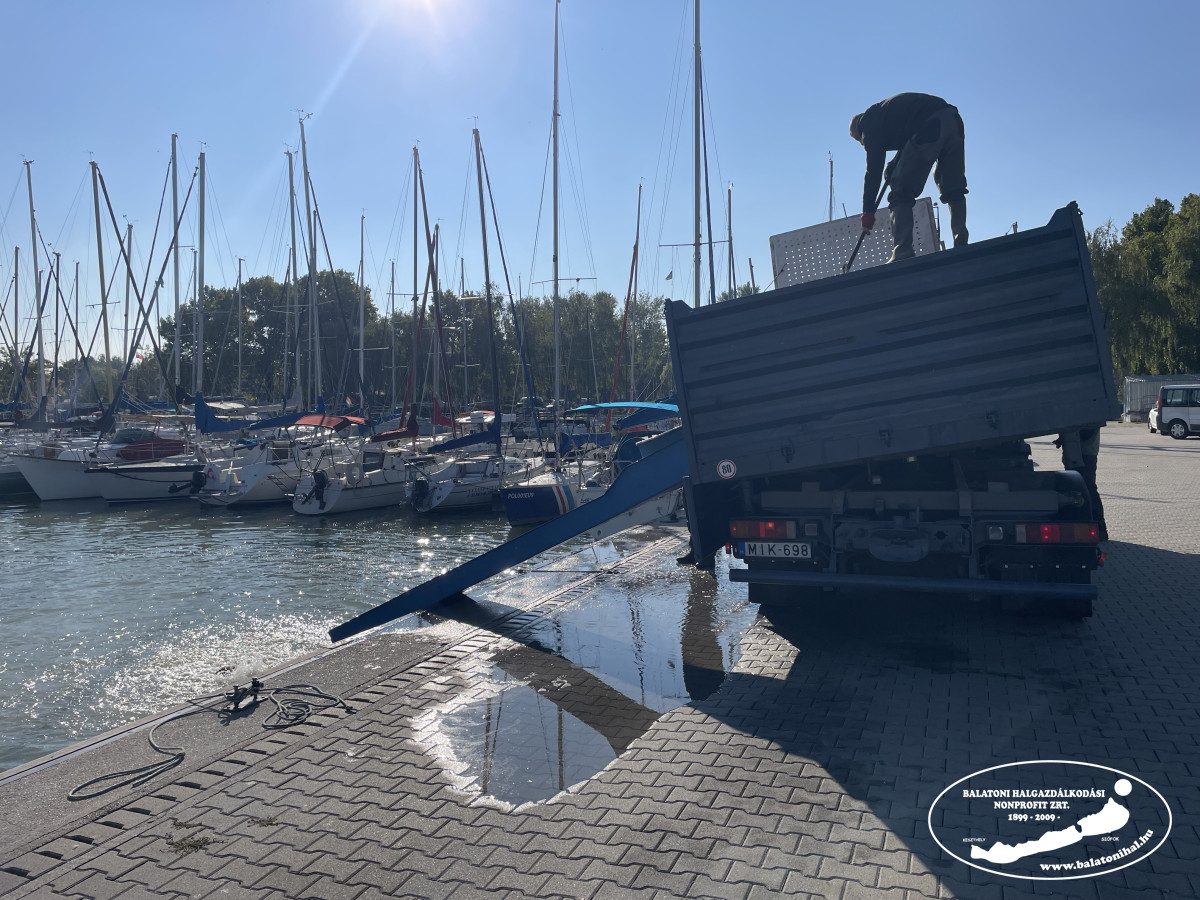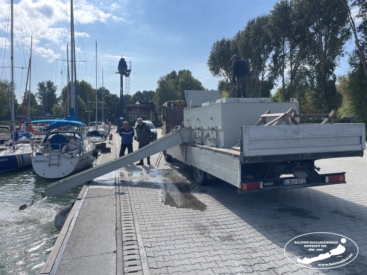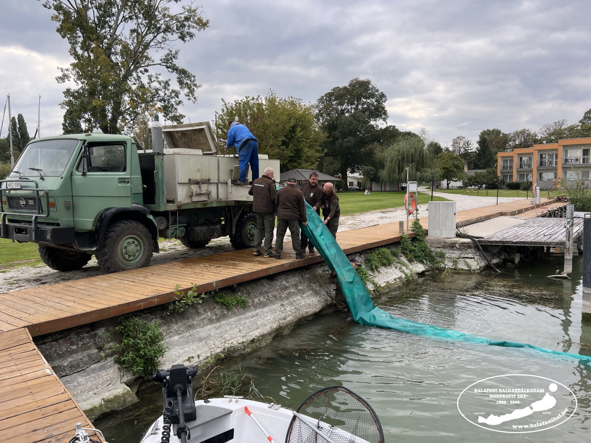 A balatonlellei kikötőben két fuvarral összesen 5 750 kg háromnyaras pontyot engedtünk le a halszállító autók kádjairól. Ezt követően a siófoki kikötőbe érkezett egy szállítmány. Itt 1 860 kg pontyot telepítettünk be a tóba.