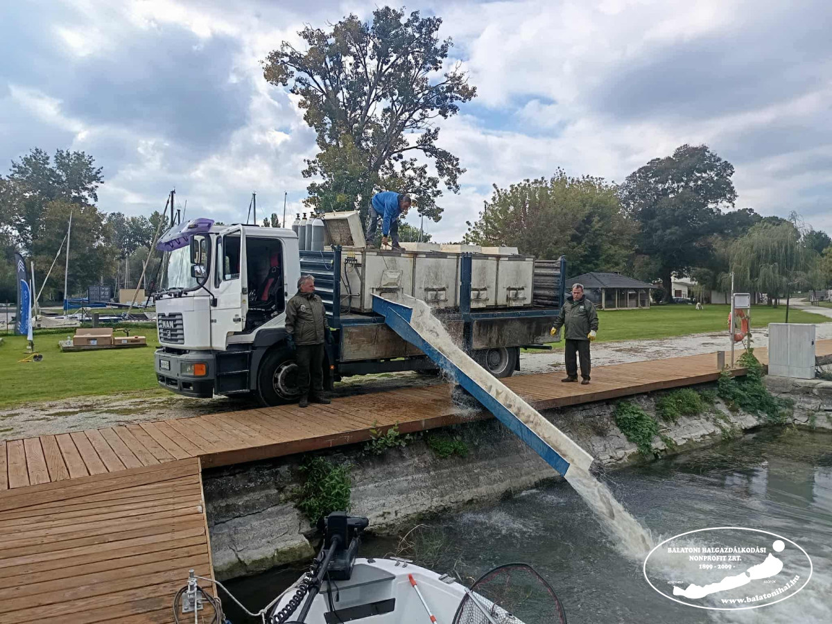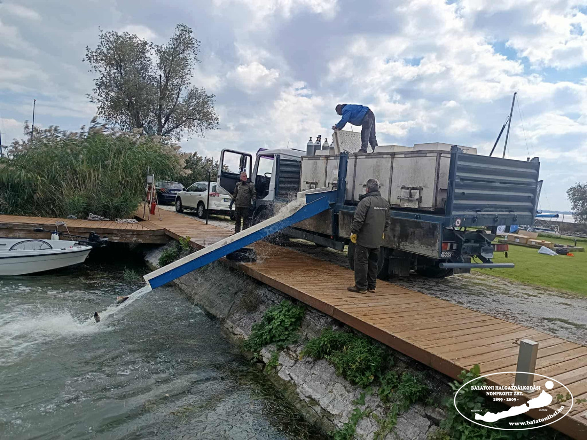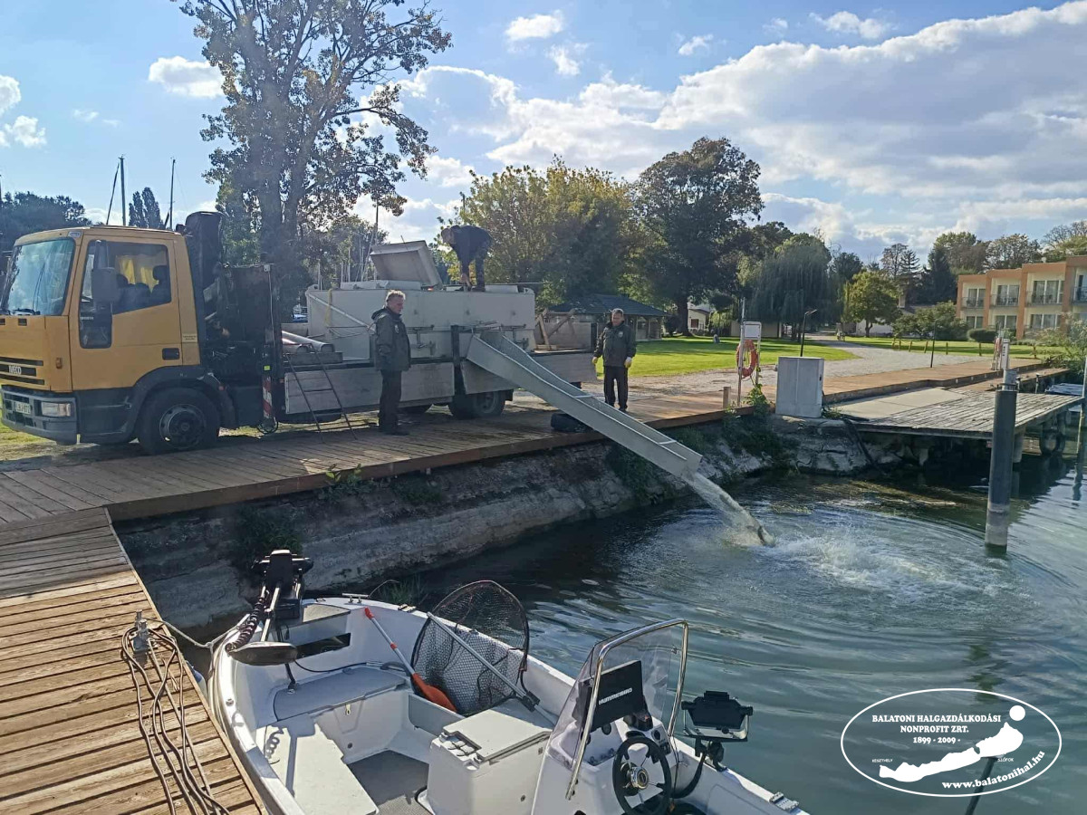 Ma két fuvarral összesen 4 525 kg háromnyaras pontyot telepítettünk a Balatonba. Ezzel együtt idén összesen 96 276 kg-ot teljesítettünk a 300.000 kg-os éves telepítési kötelezettségünkből. A fennmaradó mennyiséget decemberig fogjuk a tóba juttatni.