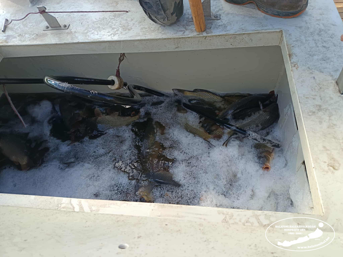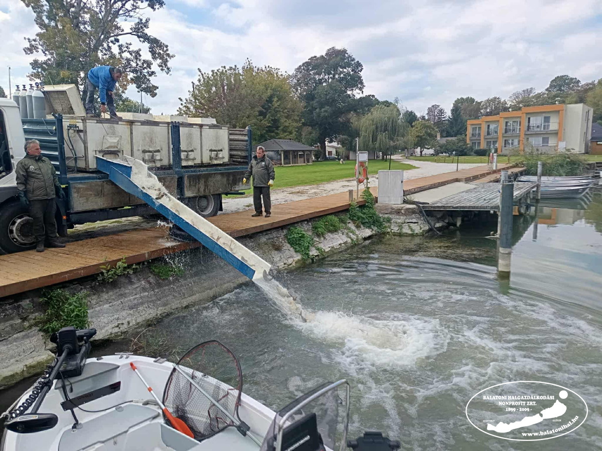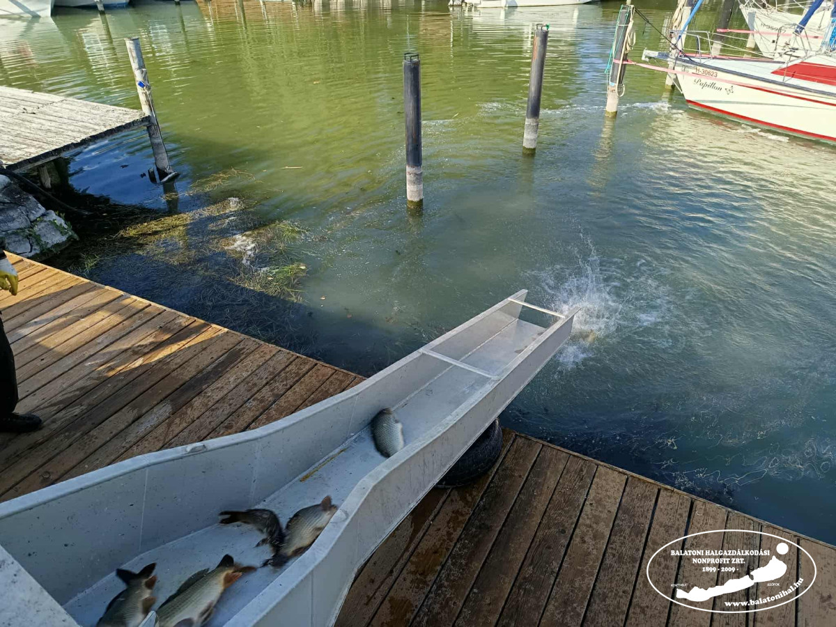 Ma két fuvarral összesen 4 525 kg háromnyaras pontyot telepítettünk a Balatonba. Ezzel együtt idén összesen 96 276 kg-ot teljesítettünk a 300.000 kg-os éves telepítési kötelezettségünkből. A fennmaradó mennyiséget decemberig fogjuk a tóba juttatni.