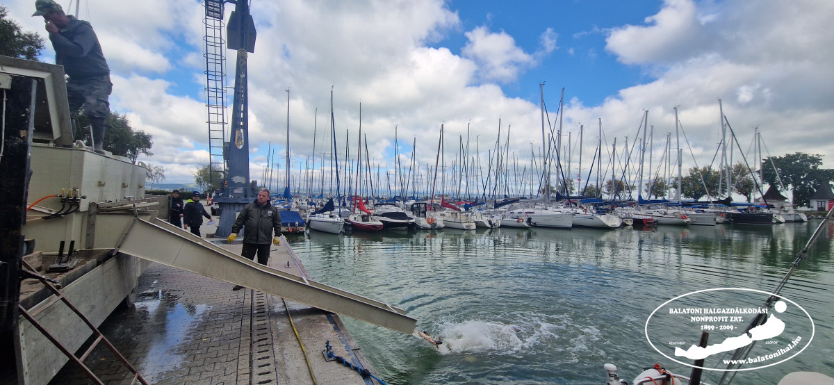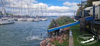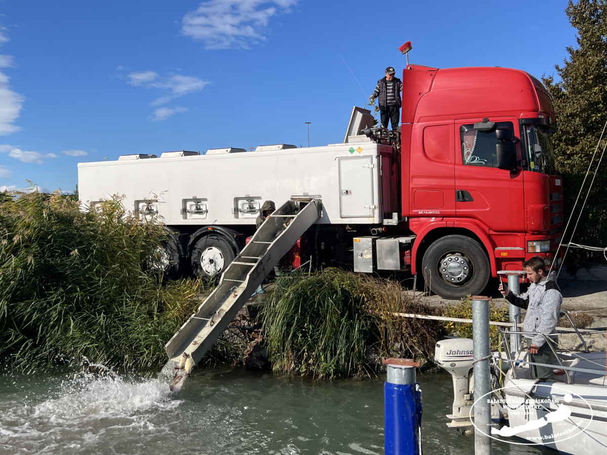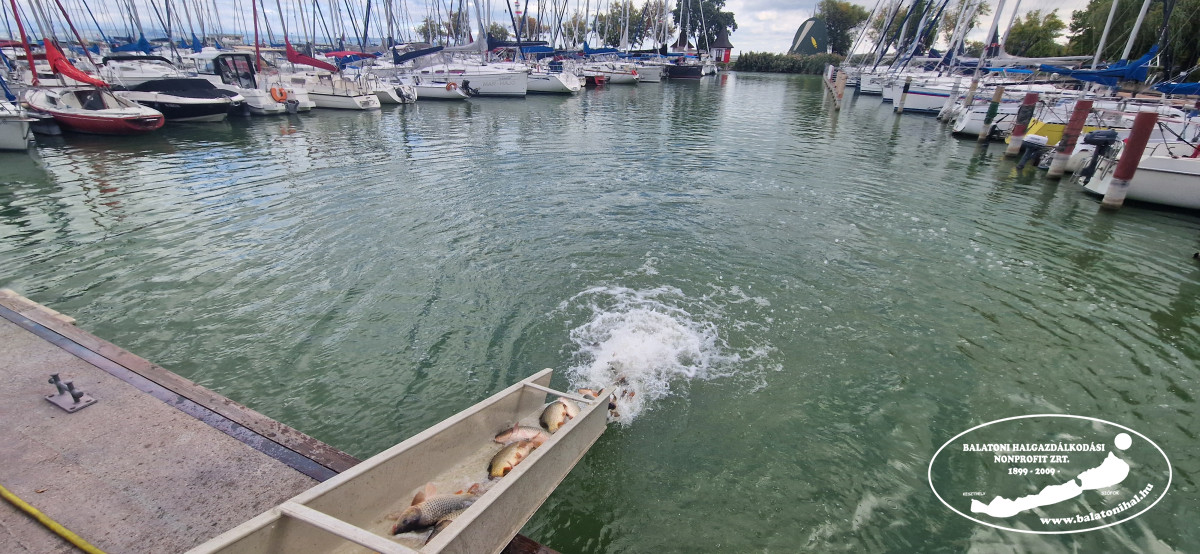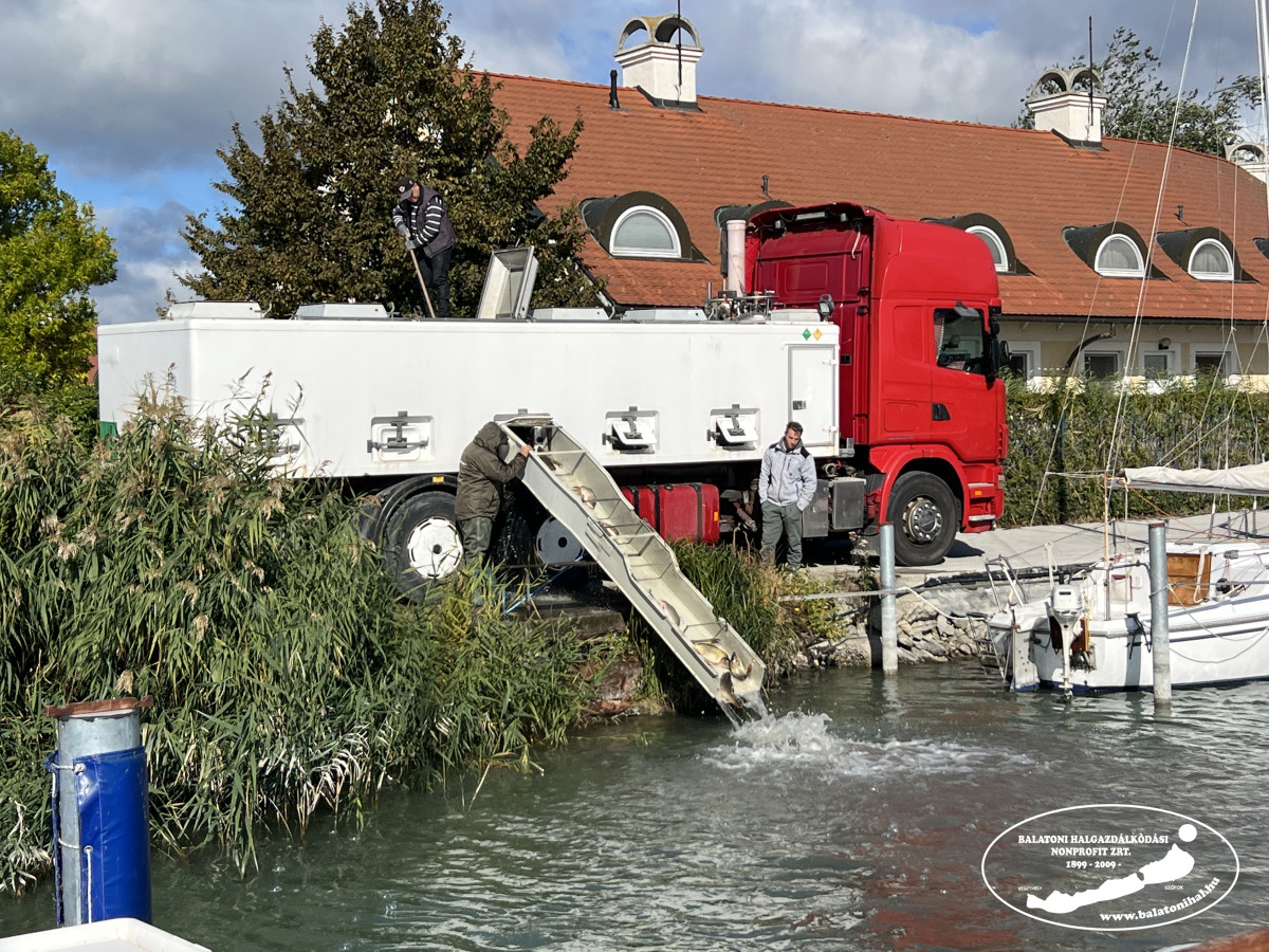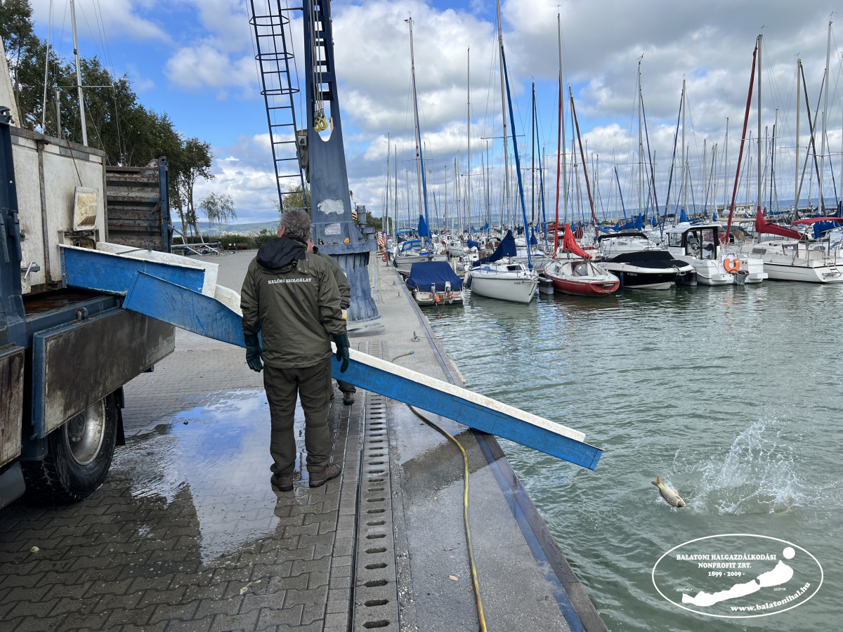 A Balatonkenesei HE kikötőjében 5151 kg, a balatonlellei kikötőben három fuvarral 9427 kg, végül pedig a siófoki kikötőben egy kis autóval 381 kg háromnyaras pontyot telepítettünk a Balatonba a helyi horgászok jelenlétében.