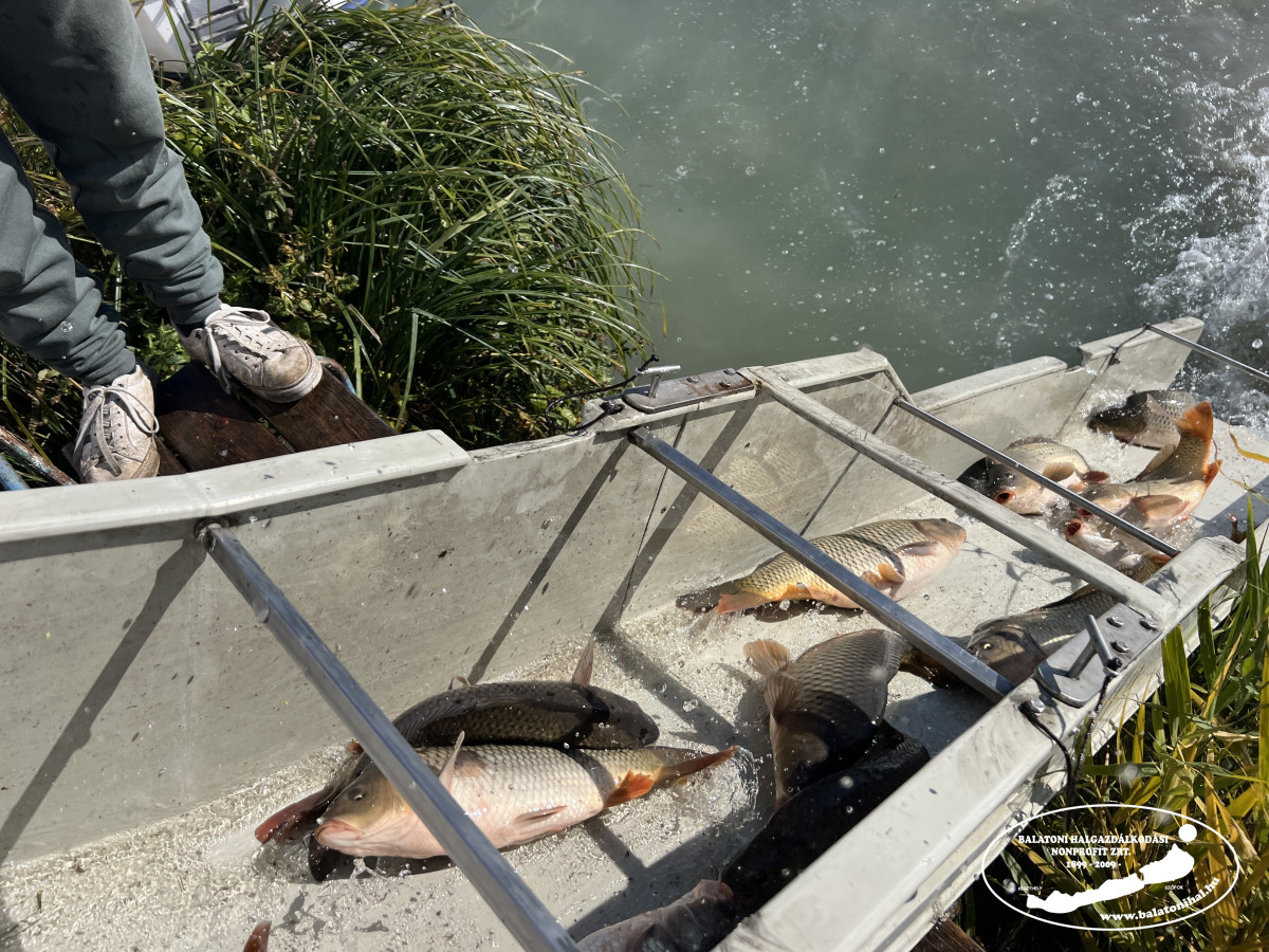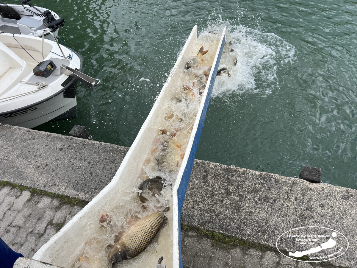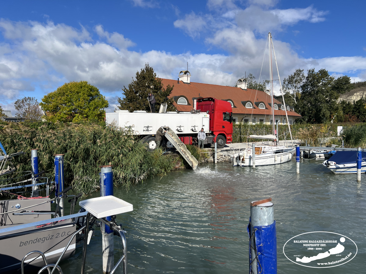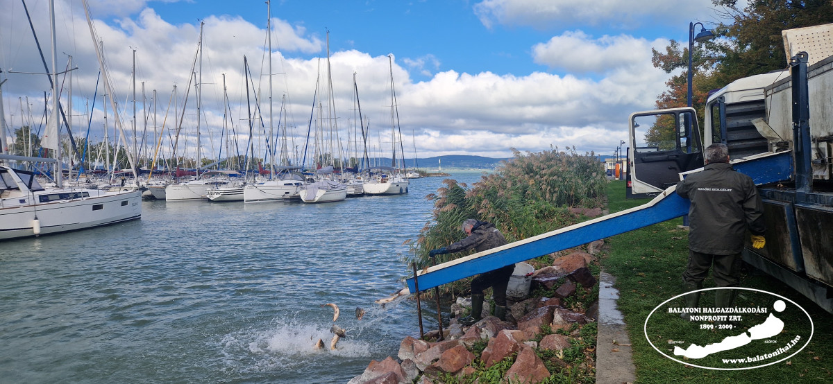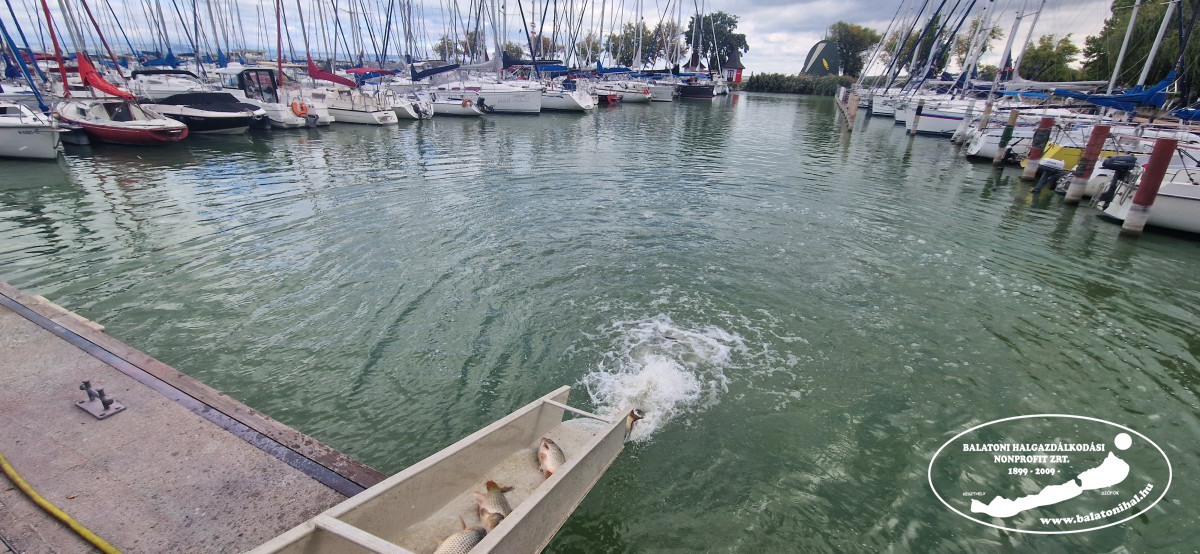 A Balatonkenesei HE kikötőjében 5151 kg, a balatonlellei kikötőben három fuvarral 9427 kg, végül pedig a siófoki kikötőben egy kis autóval 381 kg háromnyaras pontyot telepítettünk a Balatonba a helyi horgászok jelenlétében.