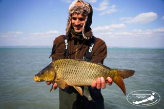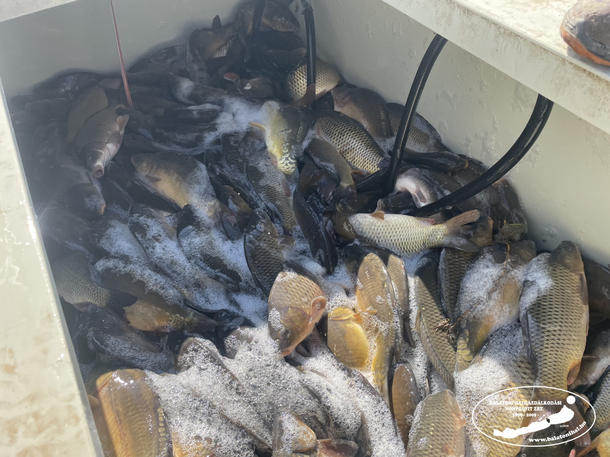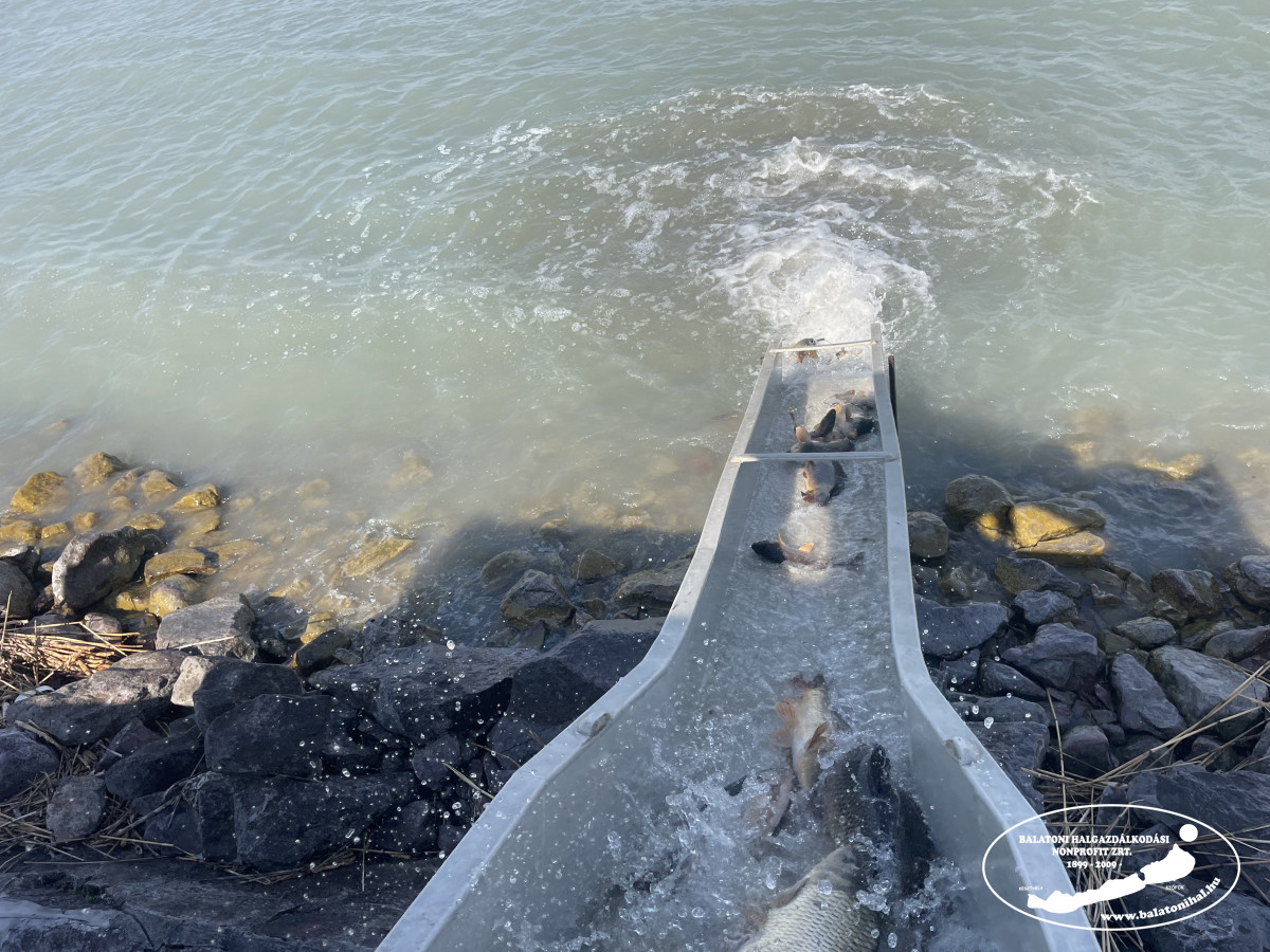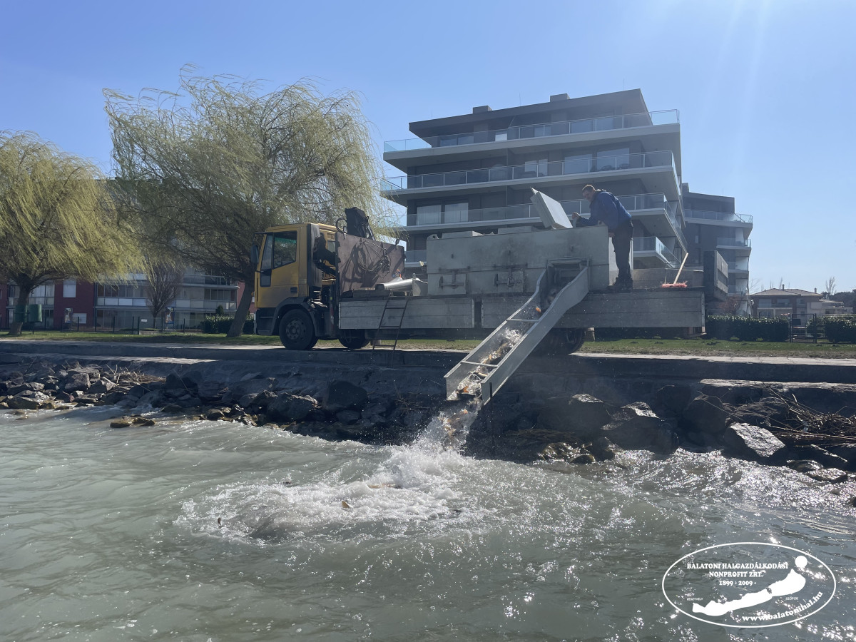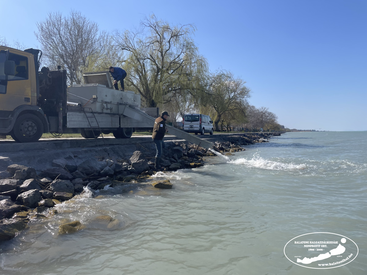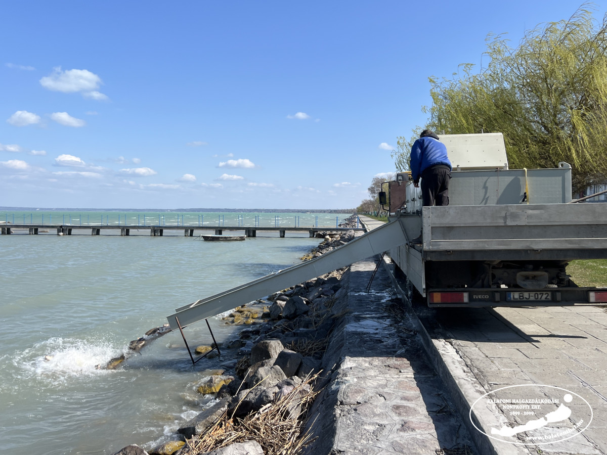 Ma Siófokon, a Magistern Hotel előtti partszakaszon történt haltelepítés. A halszállító autó kádjairól összesen 3 098 kg háromnyaras pontyot engedtünk a tóba.