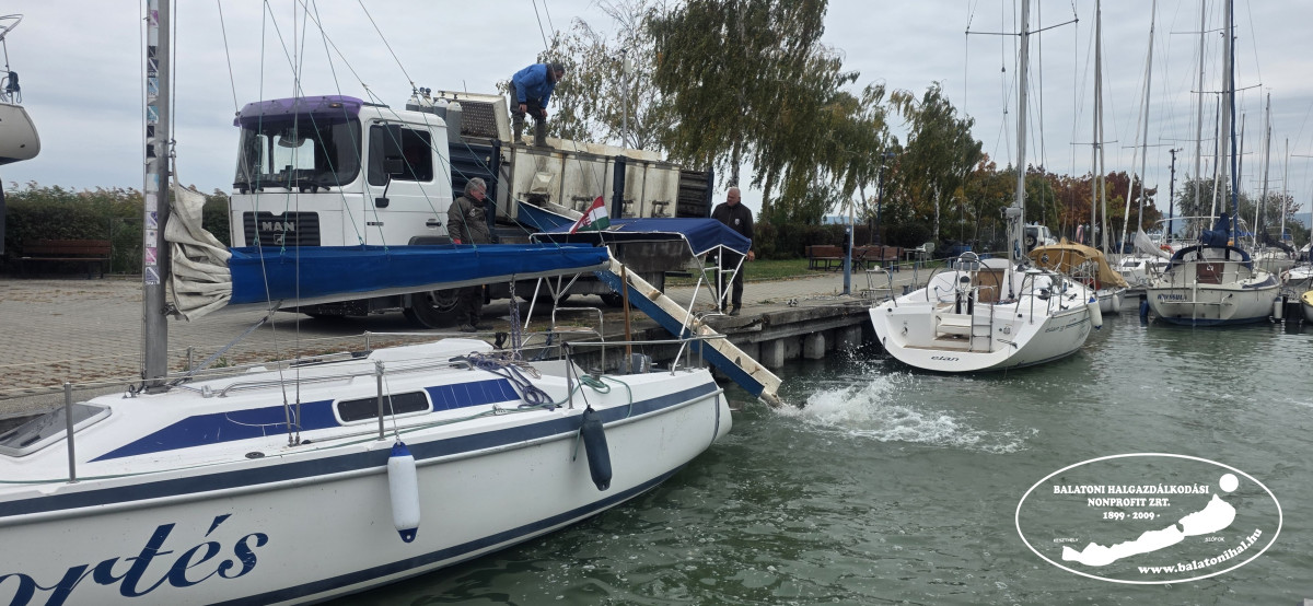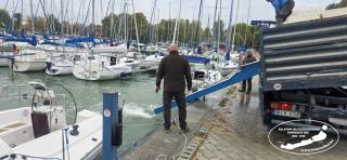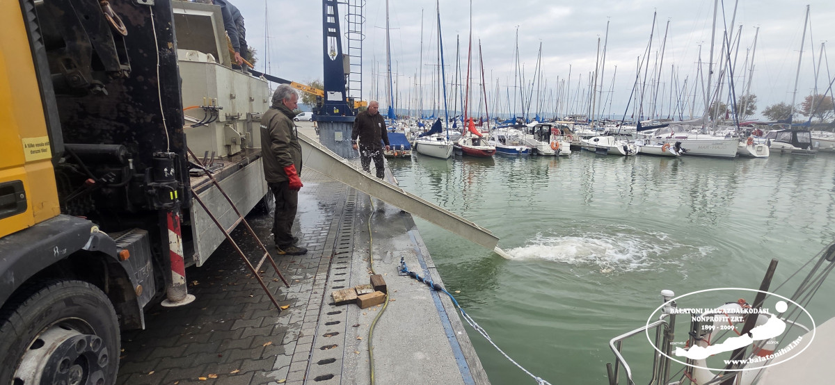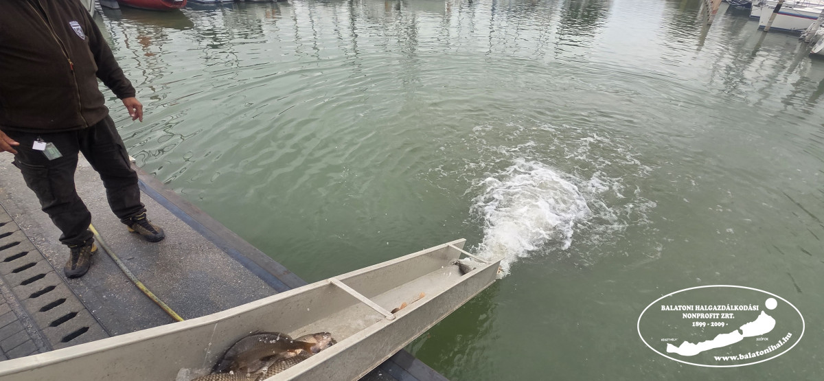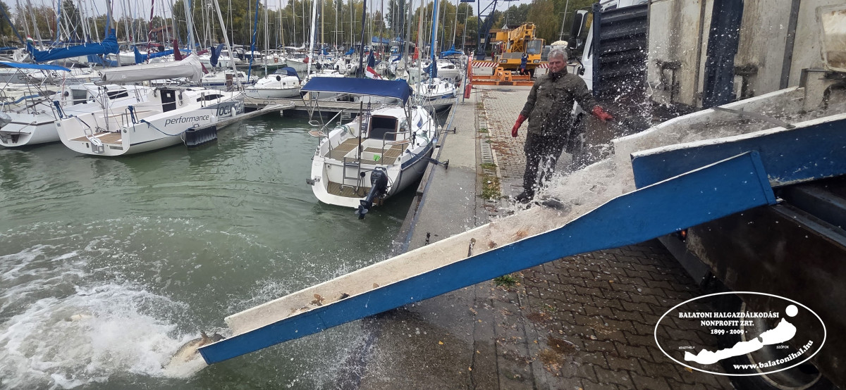 A balatonlellei kikötőben két fuvarral összesen 5 600 kg háromnyaras pontyot engedtük le a halszállító autók kádjairól.