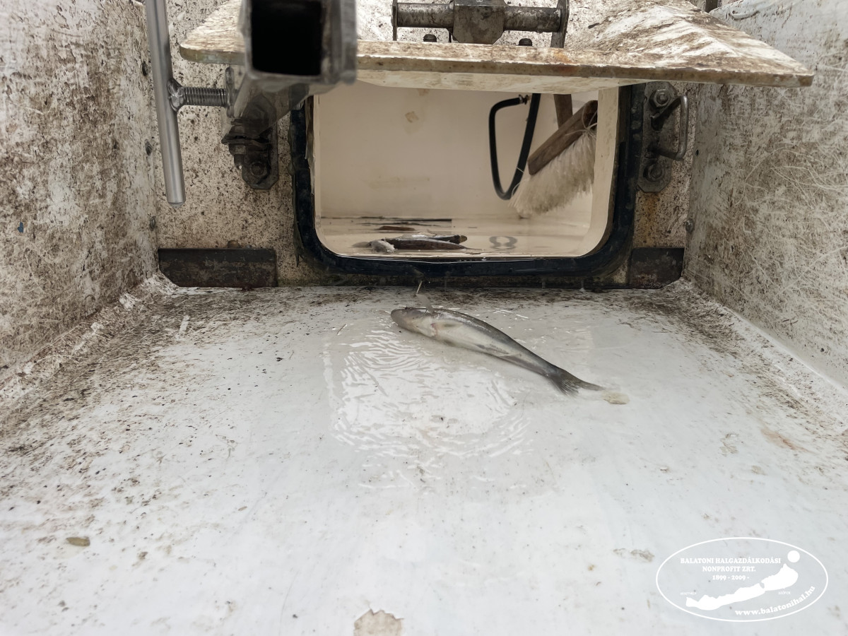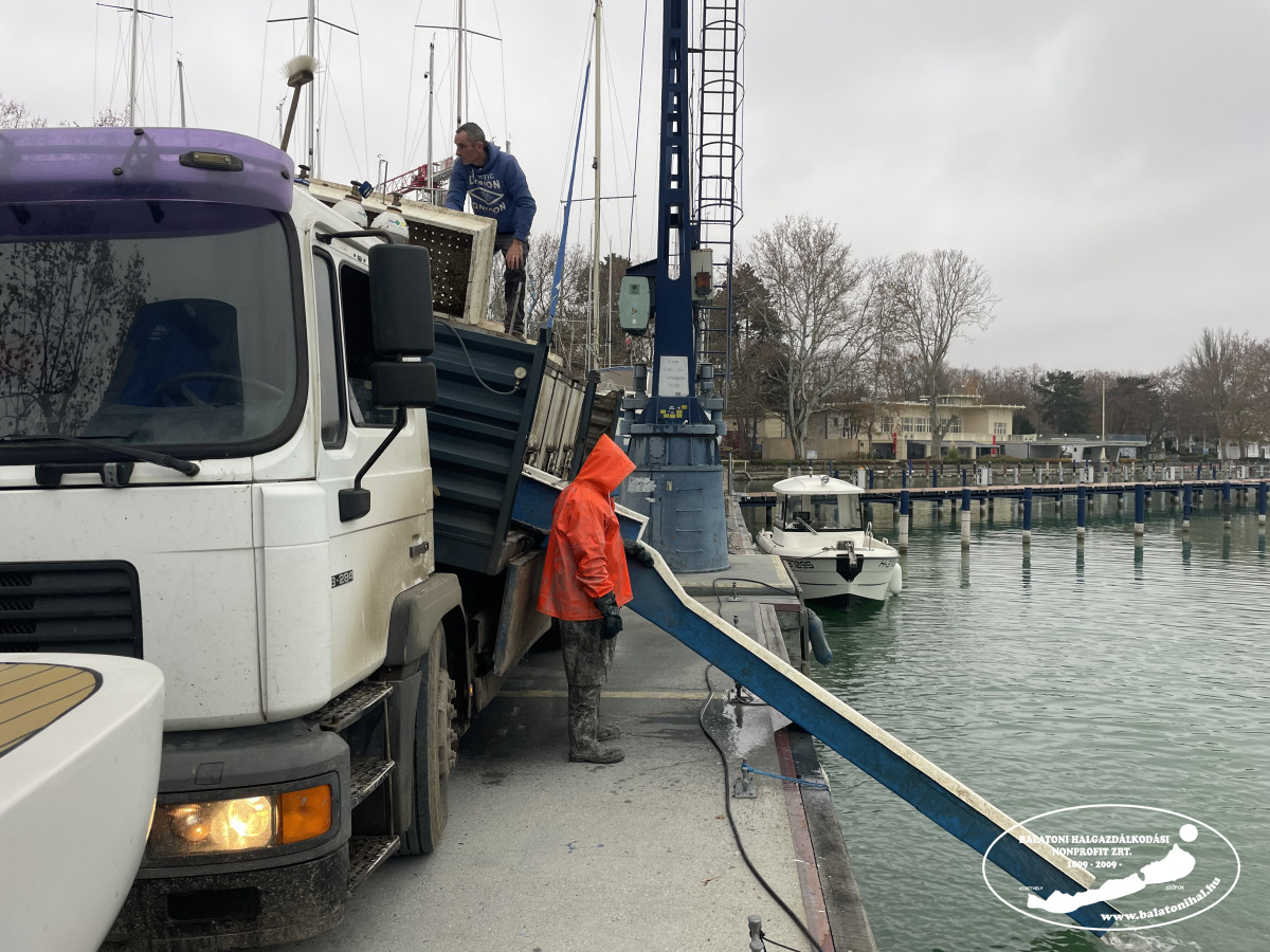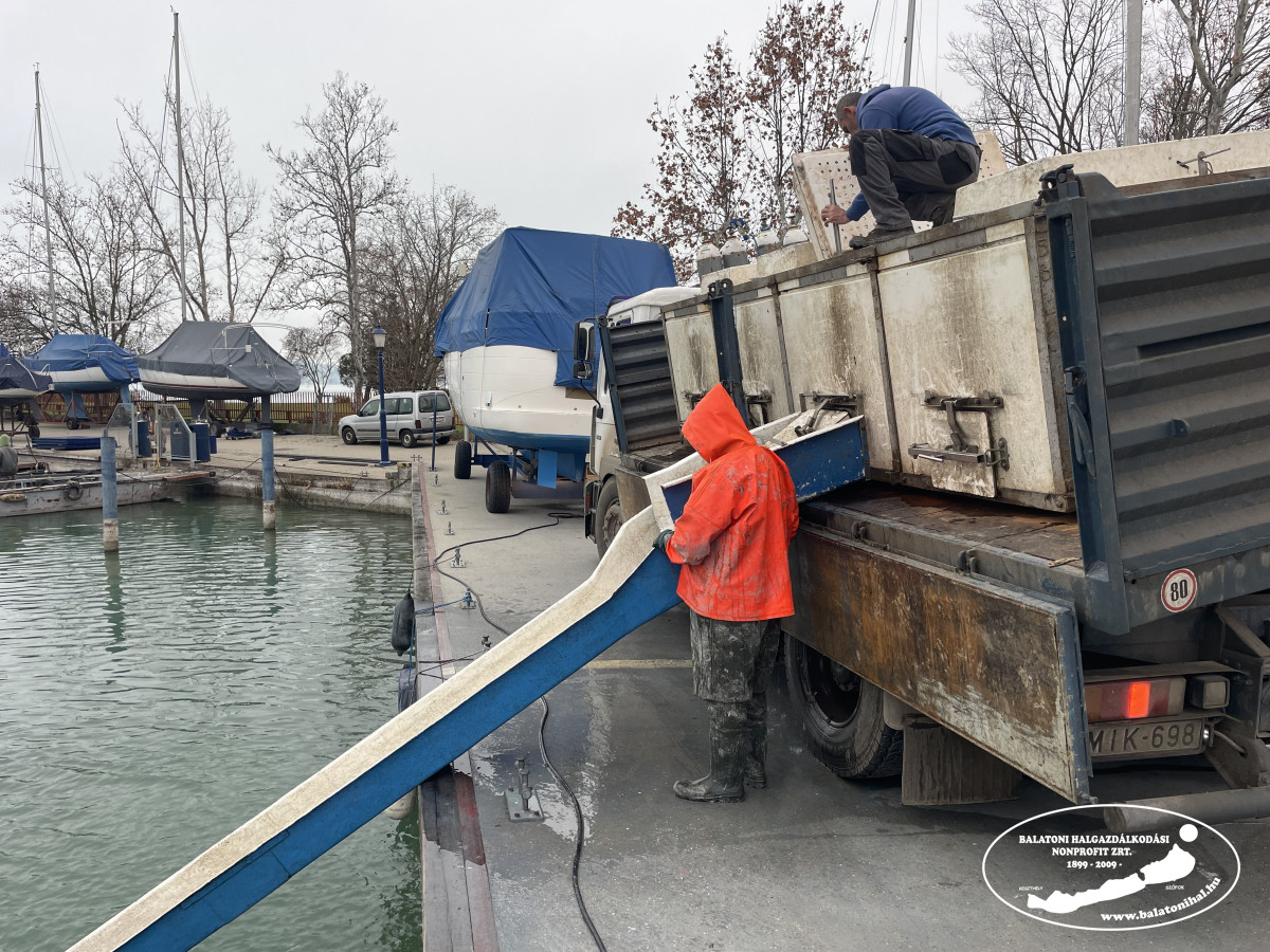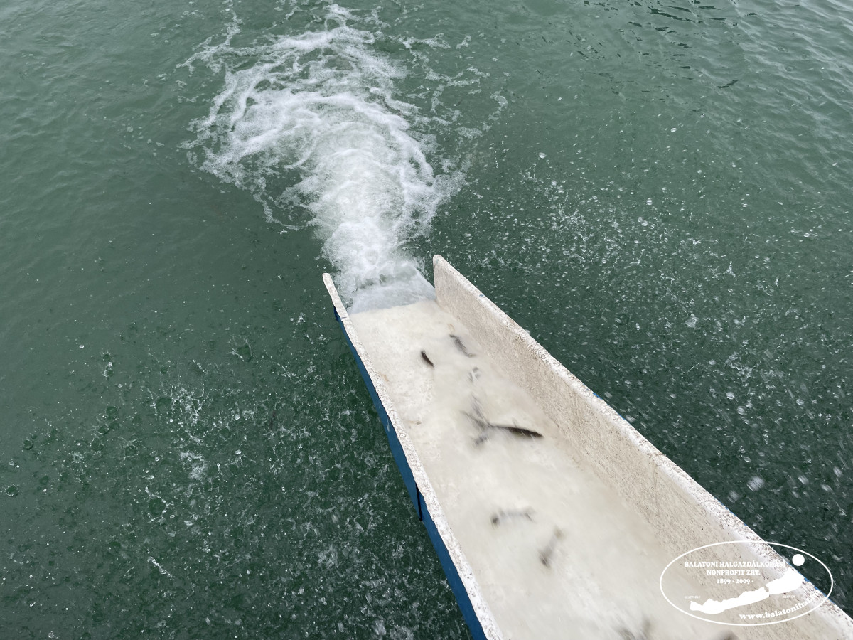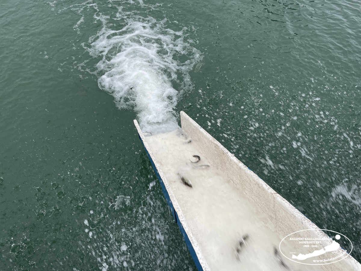 A mai halszállítmányt a balatonföldvári kikötőben engedtük le csúszda segítségével a Balatonba.