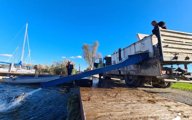 A mai napon 3590 kg háromnyaras pontyot telepítettünk a Balatonba. A mai pontytelepítésekkel együtt idén összesen 231 435 kg-ot teljesítettünk a 300.000 kg-os éves telepítési kötelezettségünkből.